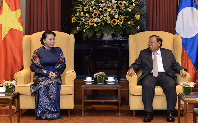 La Présidente de l’AN vietnamienne, Nguyên Thi Kim Ngân (à gauche), et le Secrétaire général du PPRL et Président laotien, Bounnhang Vorachith. Photo : NDEL.