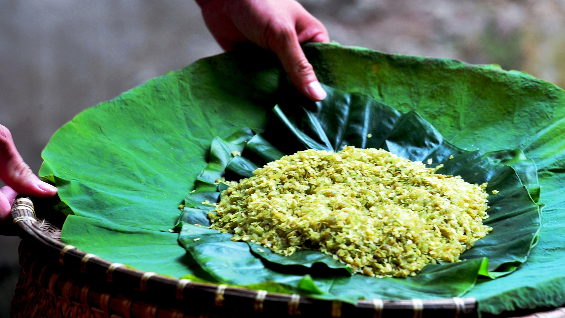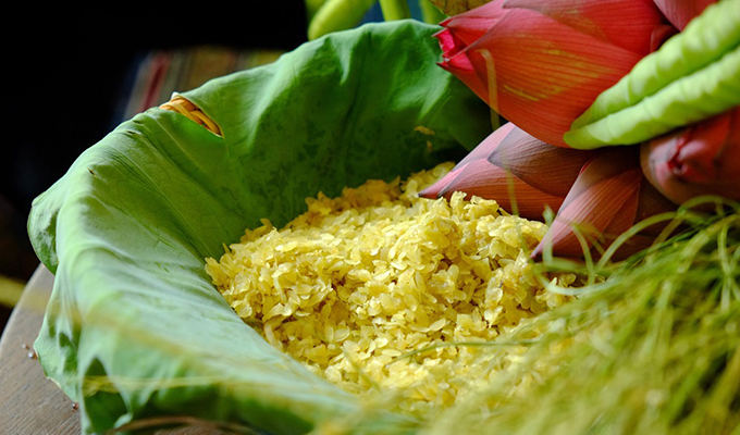 Les grains de côm decouleur verte douce sont emballés dans des feuilles de lotus, permettant ainsi de préserver leur parfum et leur saveur et s’en dégageant de leur parfum enivrant.