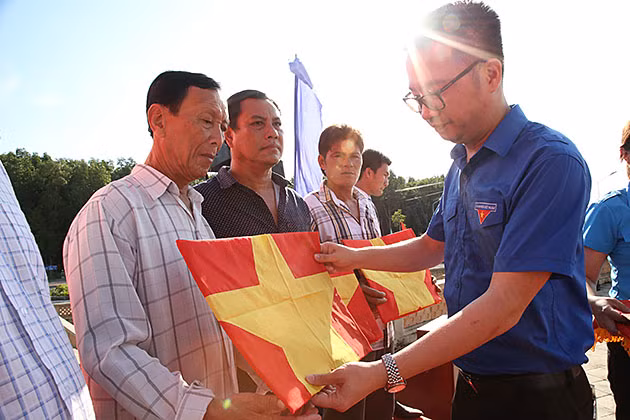 Les délégués se sont organisés en forme de la carte du Vietnam, ont chanté l'hymne national et ont vu les représentants de la Fédération de la jeunesse vietnamienne (FJV) remettre 100 drapeaux nationaux aux pêcheurs locaux pour les encourager à poursuivre la pêche hauturière en défendant la souveraineté maritime et insulaire de la Patrie.