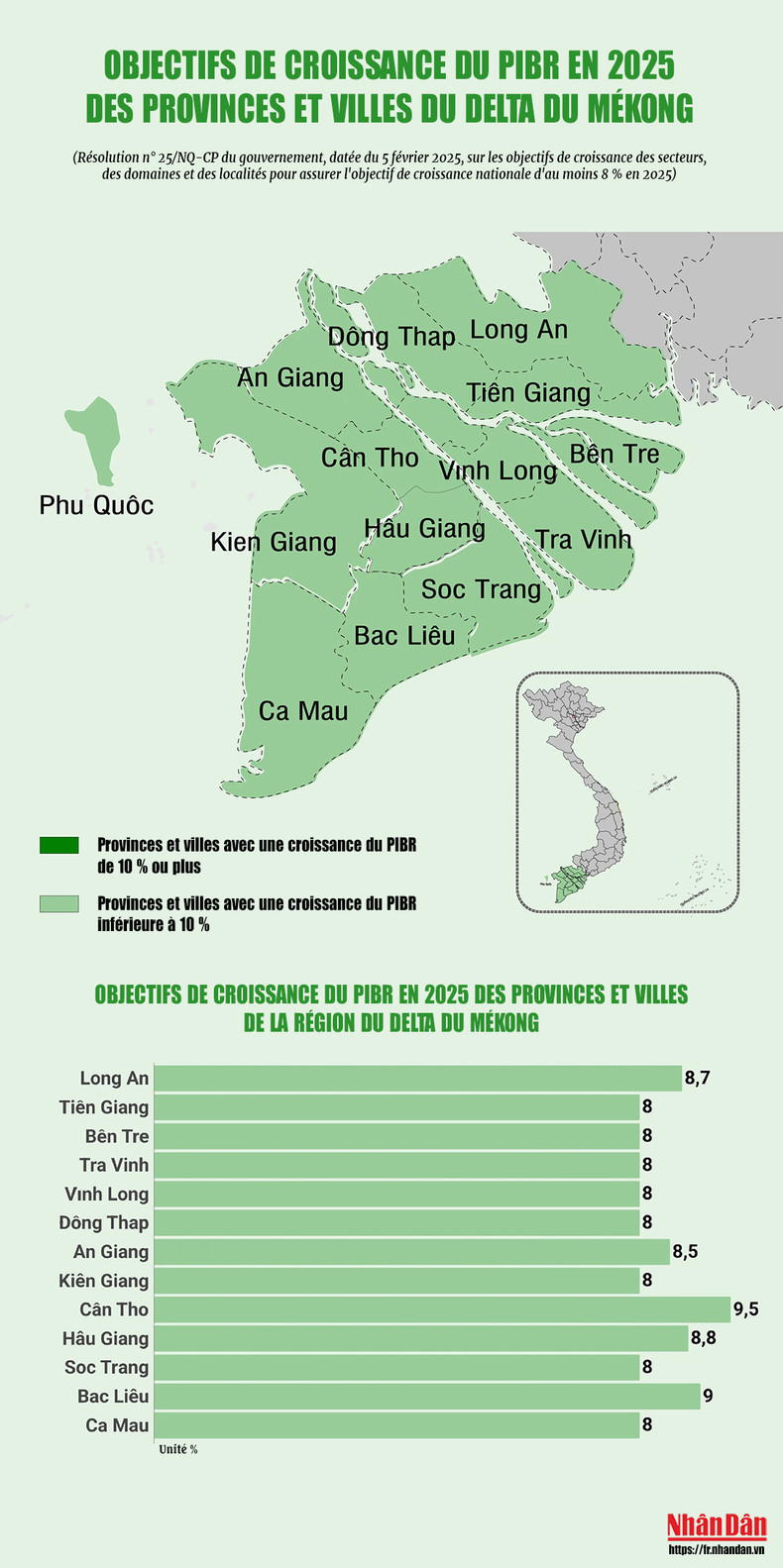 L'objectif de croissance du PIBR en 2025 des provinces et des villes de la région du delta du Mékong, au Sud du Vietnam) est de 8% à 9,5%, selon la Résolution n° 25/NQ-CP du 5 février 2025 du gouvernement sur les objectifs de croissance des industries, des secteurs et des localités pour garantir que l'objectif de croissance nationale en 2025 atteigne 8% ou plus.