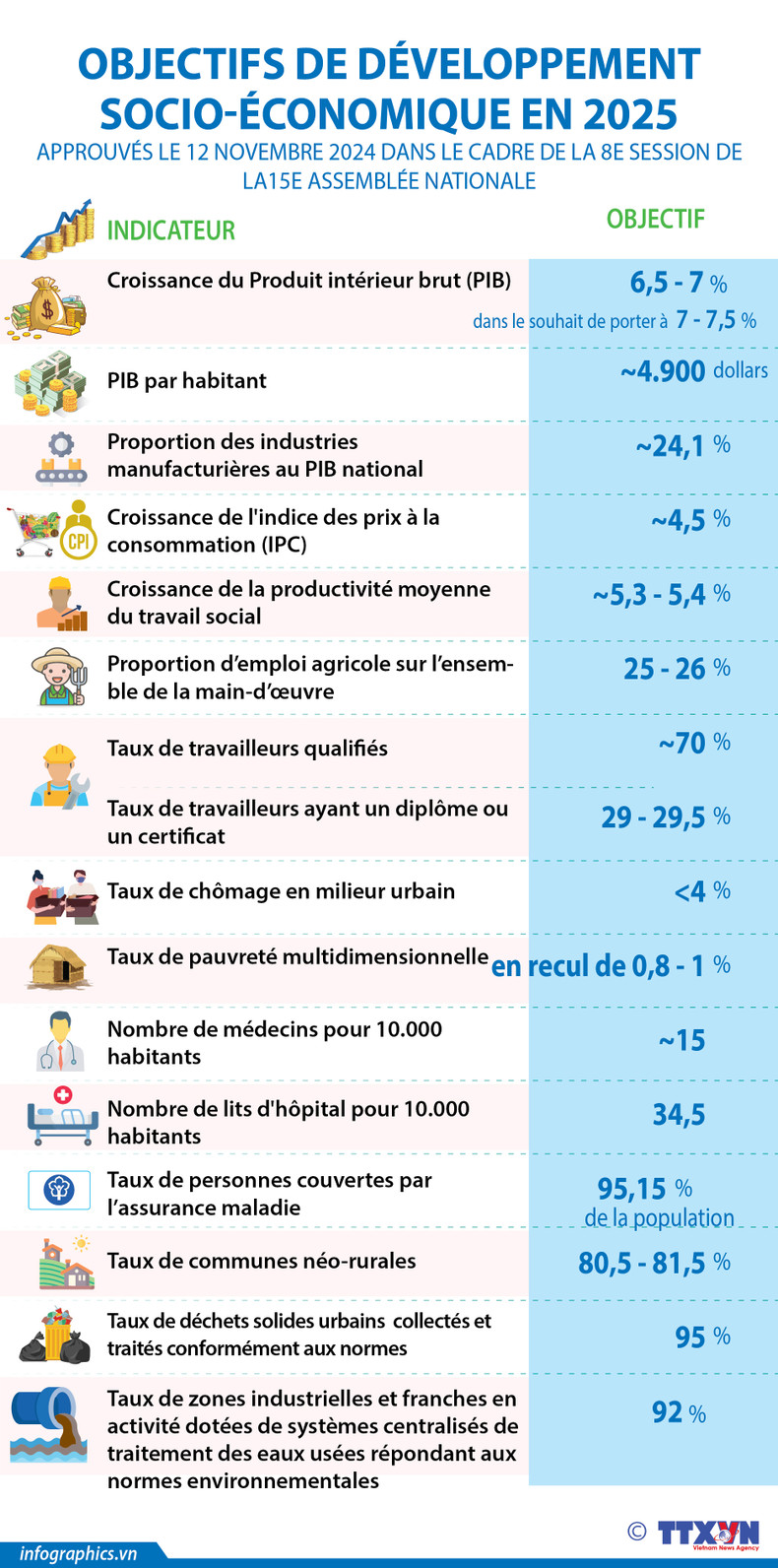 L'Assemblée nationale du Vietnam a adopté le 12 novembre la résolution sur le plan de développement socio-économique 2025. La résolution fixe l'objectif d'un taux de croissance du Produit intérieur brut (PIB) d'environ 6,5 - 7,0 %, dans le souhait de le porter à 7,0 - 7,5 %.