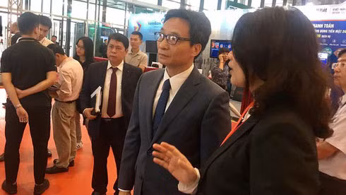 Le Vice-Premier ministre Vu Duc Dam visite des stands lors de l'exposition organisée dans le cadre du Sommet 2019 de l’Industrie 4.0 qui s'ouvre à Hanoi le 3 octobre 2019. Photo : Infonet.