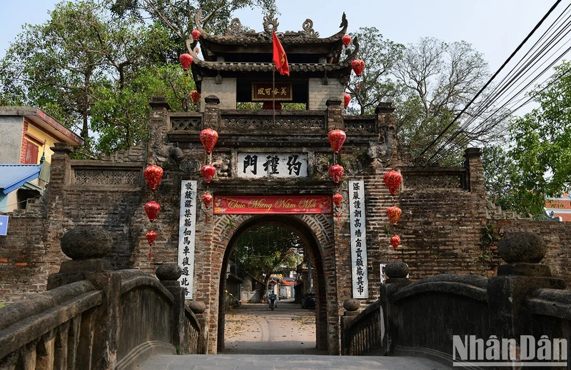 | C’est par un pont arqué de deux mètres de large et de dix mètres de long que l’on entre dans le village. Précédemment, le fossé situé en dessous du pont est une tranchée profonde entourant tout le village, où étaient plantés des arbres de bambous. Cette tranchée servait de mur de protection contre les voleurs. Photo : The Duong /NDEL |