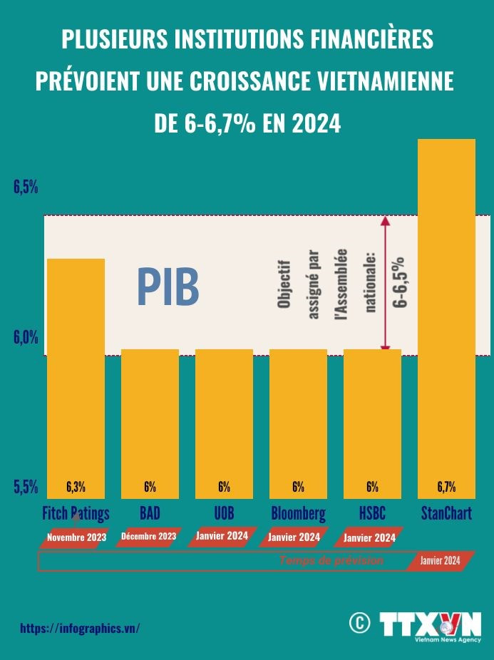 La Banque asiatique de Développement (BAD), Bloomberg et HSBC prévoient toutes que la croissance vietnamienne en 2024 pourrait atteindre 6%. Parallèlement, la Standard Chartered Bank prévoit une croissance de 6,7%, dépassant l'objectif de croissance du Vietnam de 6 à 6,5%.