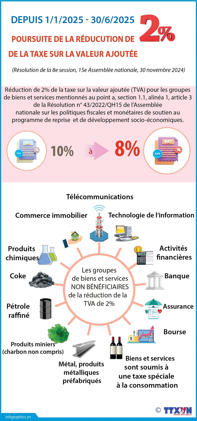 La XVe Assemblée nationale a convenu la poursuite de la réduction de 2% de la taxe sur la valeur ajoutée de 2% pour les groupes de biens et services spécifiés dans la Résolution n° 43/2022/QH15 de l'Assemblée nationale sur les politiques fiscales et monétaires de soutien au programme de reprise et de développement socio-économiques du 1er janvier au 30 juin 2025.