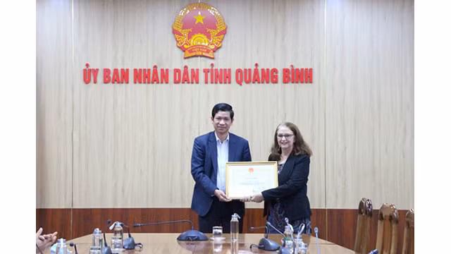 Le vice-président Hô An Phong remet le Certificat de Mérite du président du Comité populaire provincial à Kane Sharon Maree. Photo : quangbinh.gov.vn