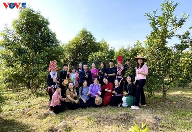 Photo souvenir d'un groupe de touristes dans un verger de Dông Van. Photo : VOV.