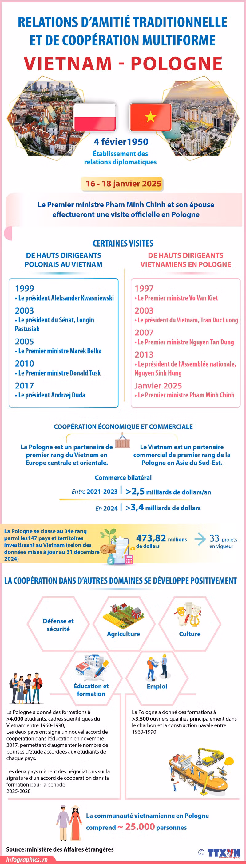 À l'invitation de son homologue polonais Donald Tusk, le Premier ministre Pham Minh Chinh et son épouse, accompagnés d'une délégation vietnamienne de haut rang, effectueront du 16 au 18 janvier une visite officielle en Pologne.
