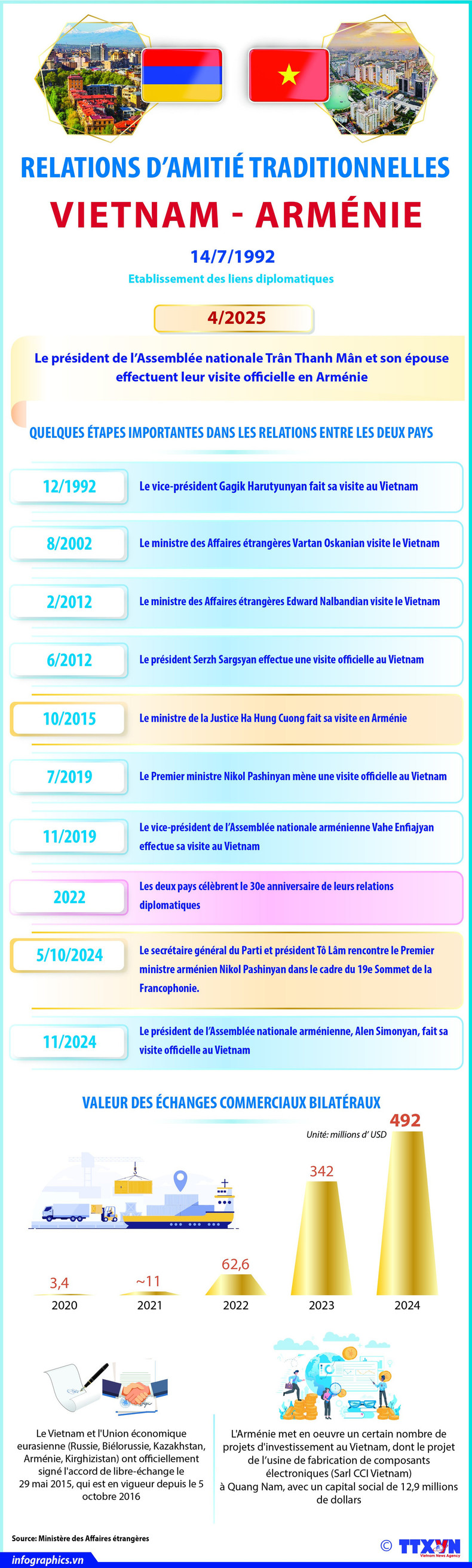 Le président de l'Assemblée nationale du Vietnam, Trân Thanh Mân, et son épouse effectuent une visite officielle en Arménie du 2 au 8 avril, à l'invitation du président de l'Assemblée nationale arménienne, Alen Simonyan. Il s'agit de la première visite officielle en Arménie du leader de l'organe législatif depuis l'établissement des relations diplomatiques entre les deux pays en 1992.
