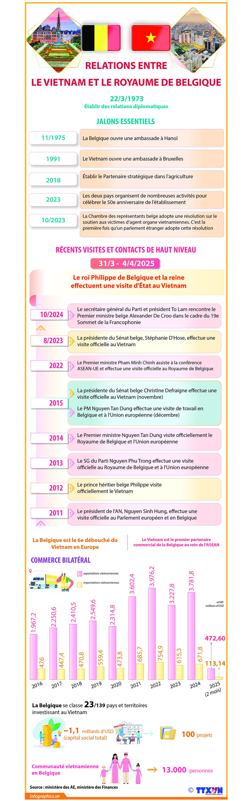 À l'invitation du président vietnamien Luong Cuong et de son épouse, le Roi Philippe de Belgique et la Reine effectuent une visite d'État au Vietnam du 31 mars au 4 avril.