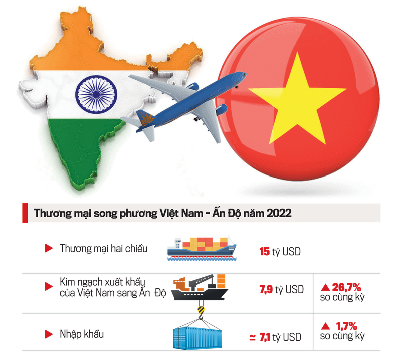 En 2022, le commerce bilatéral entre le Vietnam et l'Inde a atteint 15 milliards de dollars, le plus haut niveau jamais enregistré. Le chiffre d'affaires des exportations du Vietnam vers l'Inde a atteint 7,9 milliards de dollars, en hausse de 26,7% par rapport à 2021. Le chiffre d'affaires des importations du Vietnam en provenance de l'Inde a atteint environ 7,1 milliards de dollars, en hausse de 1,7 % par rapport à 2021.