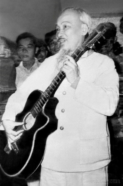 La première Conférence culturelle nationale (24 novembre 1946) est considérée comme un tournant historique, affirmant la place et l'importance particulière de la culture et du peuple vietnamiens dans la construction et la défense du pays. À gauche: Le Président Ho Chi Minh assiste à l'inauguration de l'Exposition culturelle à l'Opéra de Hanoï, le 7 octobre 1945. À droite: Le Président Ho Chi Minh joue à la guitare à l'École de culture et d'arts de Hai Phong lors de sa visite. Photo : VNA