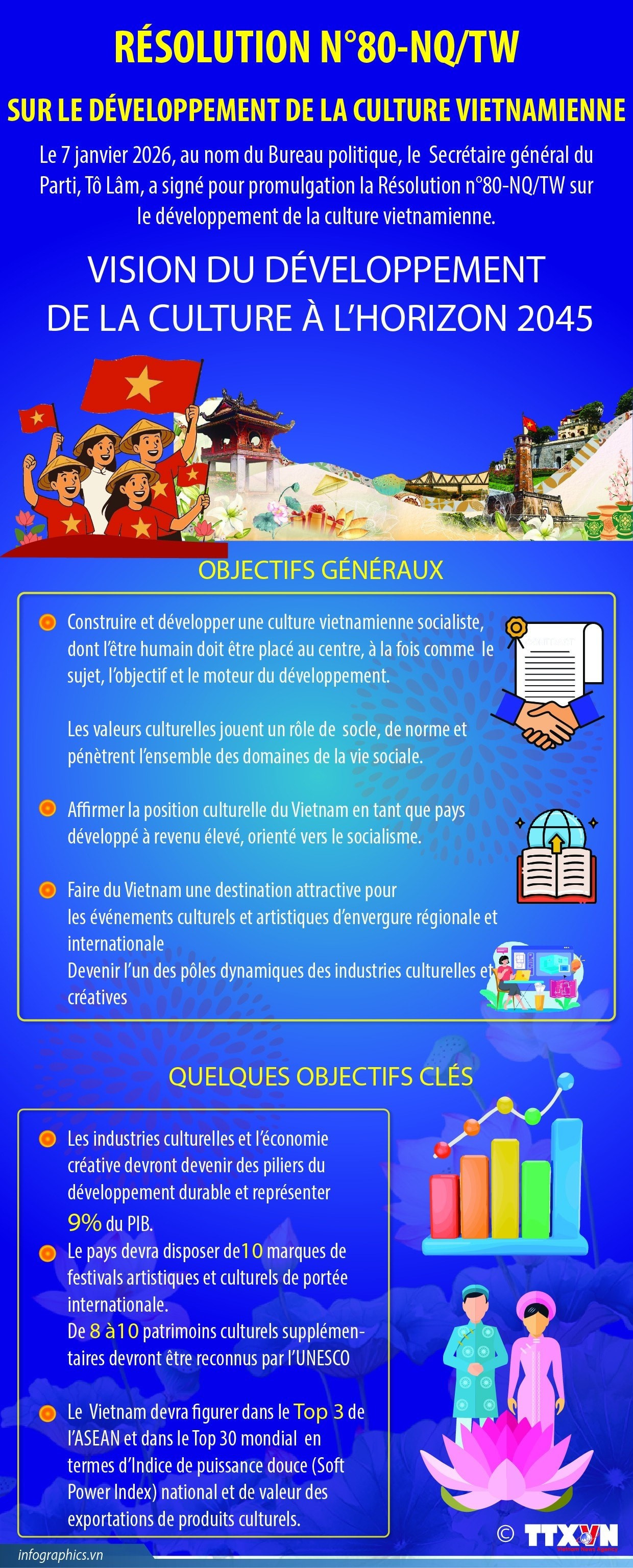 Dans un contexte d’intégration internationale approfondie, la culture devient un « langage commun » reliant les nations. La Résolution n°80 vise à renforcer le soft power national et à faire du Vietnam une destination attractive pour des événements culturels et artistiques de portée régionale et mondiale.