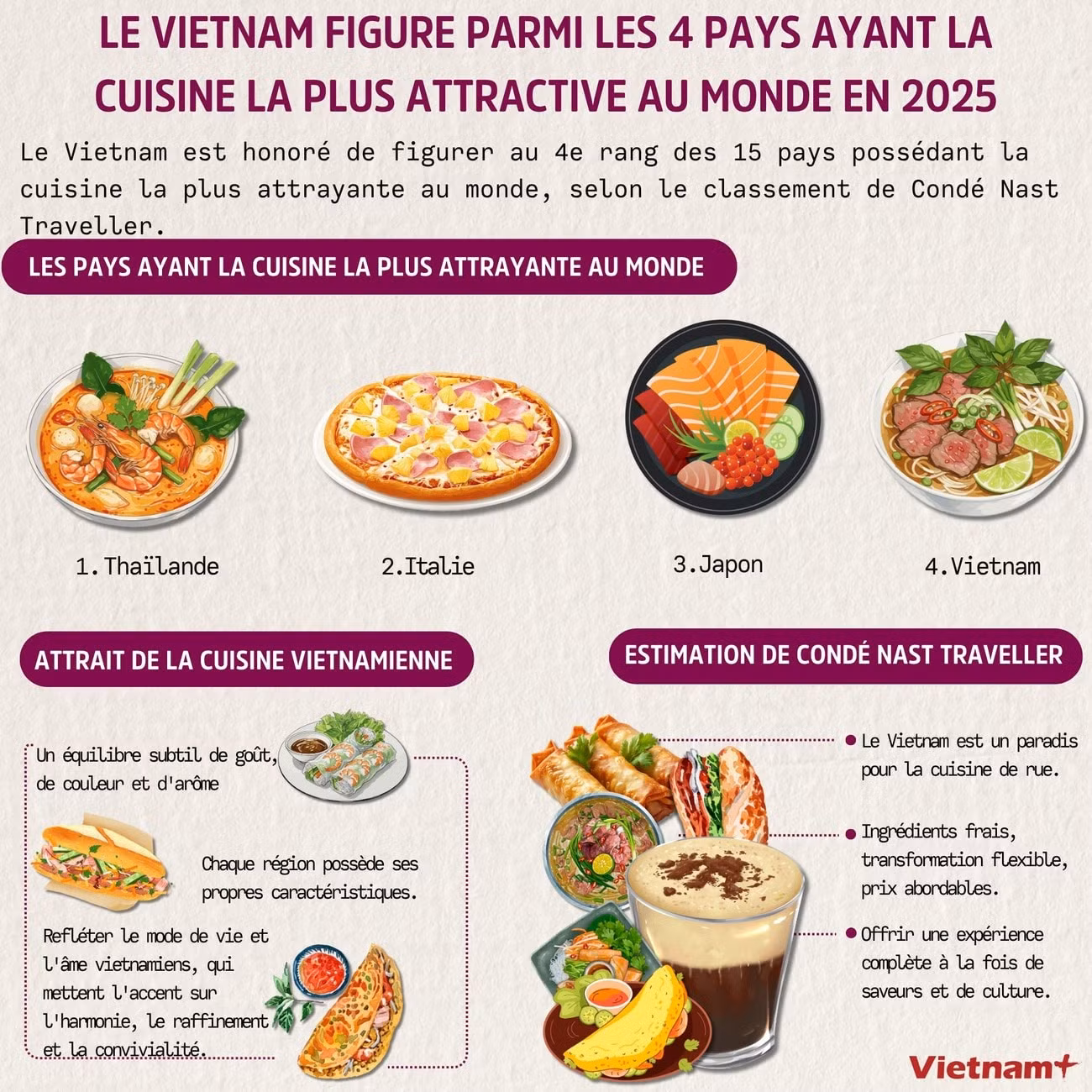 La gastronomie vietnamienne, avec des plats devenus des symboles mondiaux tels que le pho, le bun cha, les goi cuôn, le com tâm ou encore le café vietnamien, affirme de plus en plus son rôle de vecteur efficace de la diplomatie culturelle, diffusant l’image du pays et du peuple vietnamiens à travers le monde.