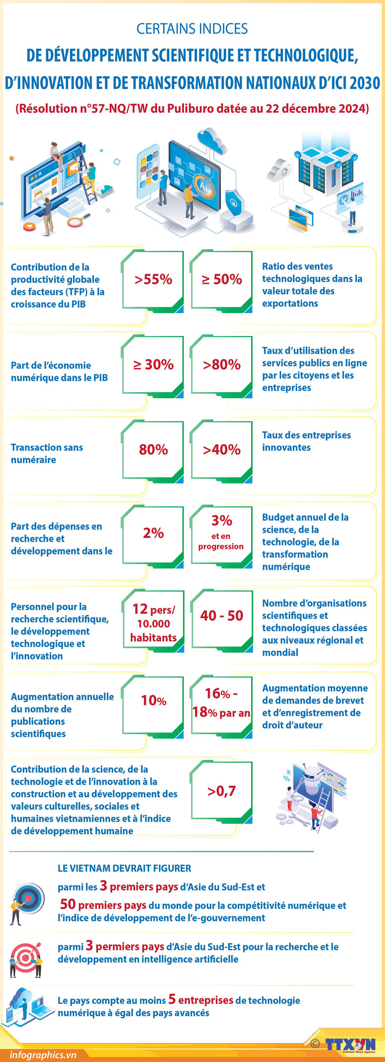 Selon la résolution n°57-NQ/TW du Politburo datée du 22 décembre 2024, le Vietnam devrait figuer parmi les trois premiers pays d'Asie du Sud-Est et les 50 premiers pays du monde pour la compétitivité numérique et l'indice de développement de l'e-gouvernement.