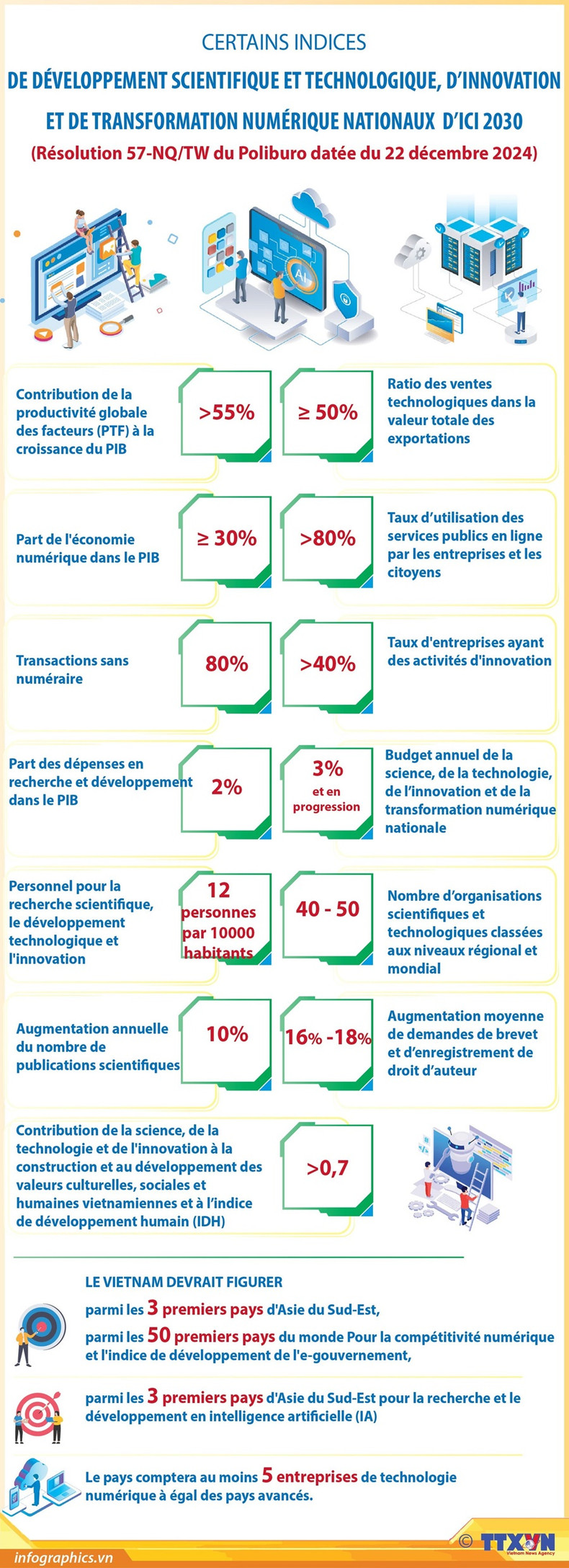 Selon la résolution n°57-NQ/TW du Bureau Politique datée du 22 décembre 2024, le Vietnam devrait figurer parmi les trois premiers pays d'Asie du Sud-Est et les 50 premiers pays du monde pour la compétitivité numérique et l'indice de développement de l'e-gouvernement.