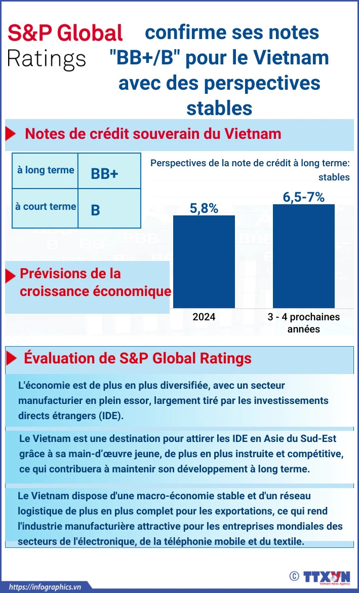 L'agence de notation de crédit S&P Global Ratings confirme ses notes de crédit souverain pour le Vietnam à « BB+ » à long terme et à « B » à court terme. Les perspectives de la note de crédit souverain à long terme sont stables.