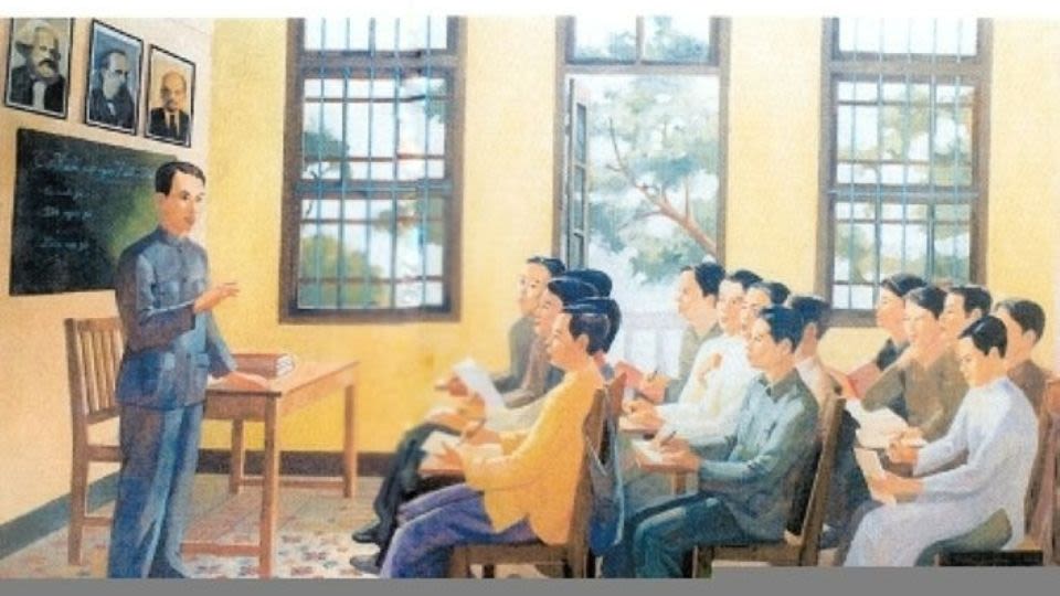 Peinture : « Nguyên Ai Quôc enseignant dans une classe de formation des cadres révolutionnaires vietnamiens à Canton, en Chine ».