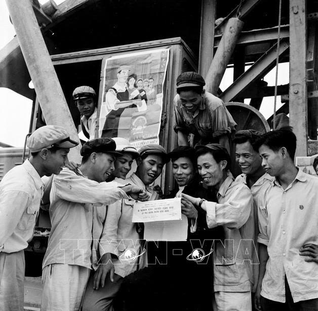 Des ouvriers conducteurs de tracteurs de la zone sidérurgique de Thai Nguyen (au Nord du Vietnam) échangent et discutent de la liste des candidats à l’Assemblée nationale de la IIe législature (avril 1960).