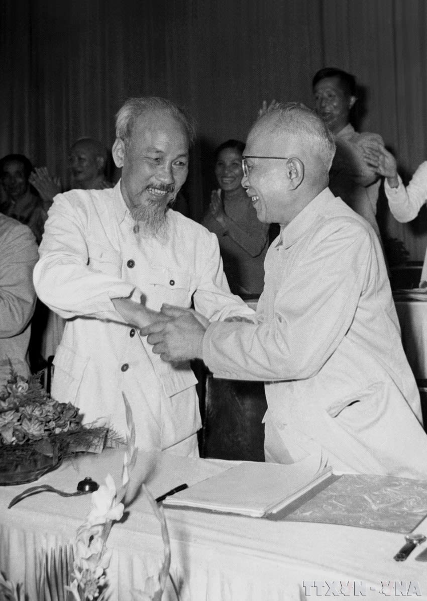 Le Président Hô Chi Minh félicite le camarade Ton Duc Thang pour son élection au poste de Vice-président de la République, lors de la première session de l’Assemblée nationale de la IIe législature (juillet 1960).