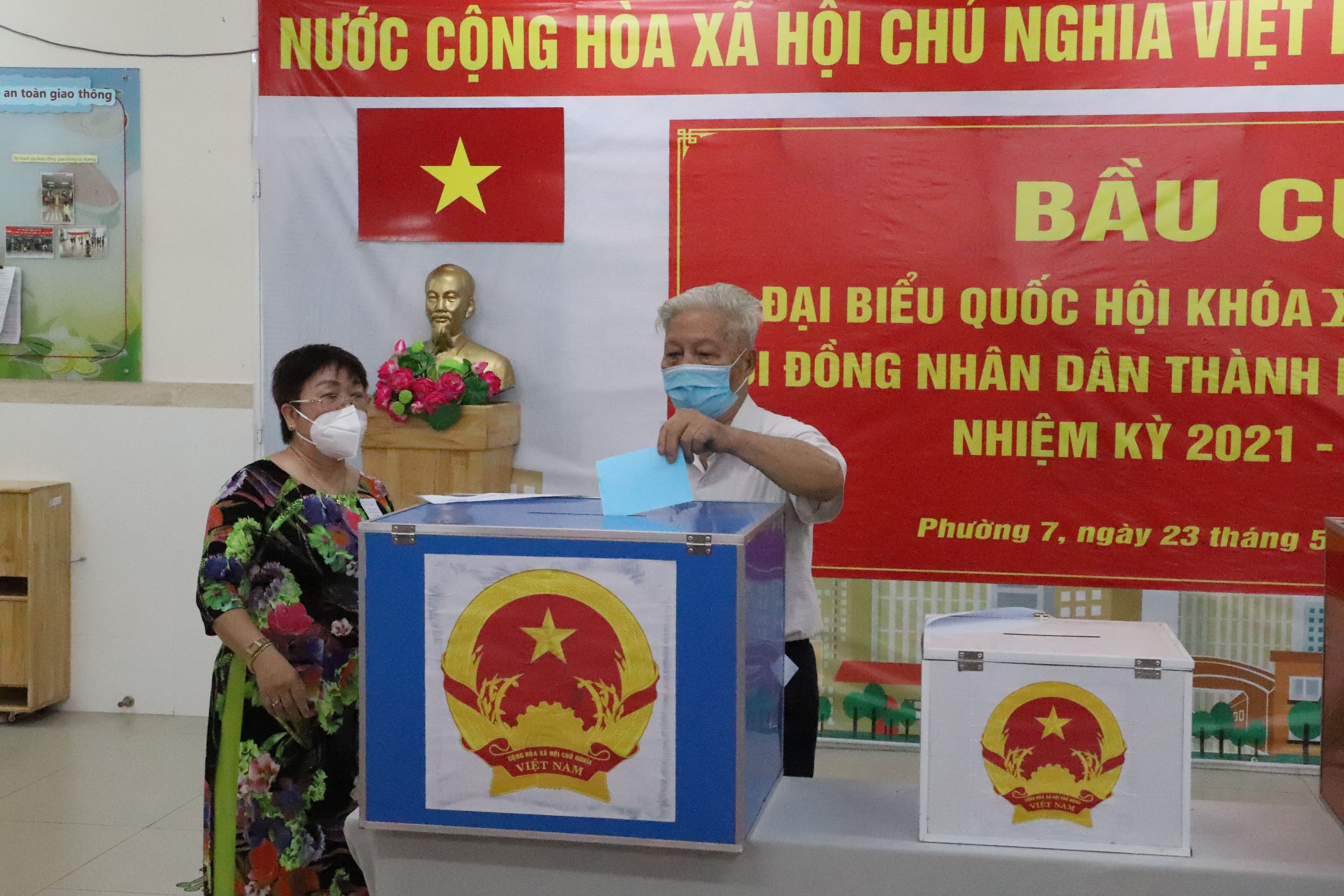 Des électeurs déposent leur bulletin pour élire les députés de l’Assemblée nationale de la XVᵉ législature et les représentants des Conseils populaires à tous les niveaux pour le mandat 2021-2026, au bureau de vote no 062, dans le quartier 7, arrondissement de Tan Binh, à Hô Chi Minh-Ville, au Sud du Vietnam.