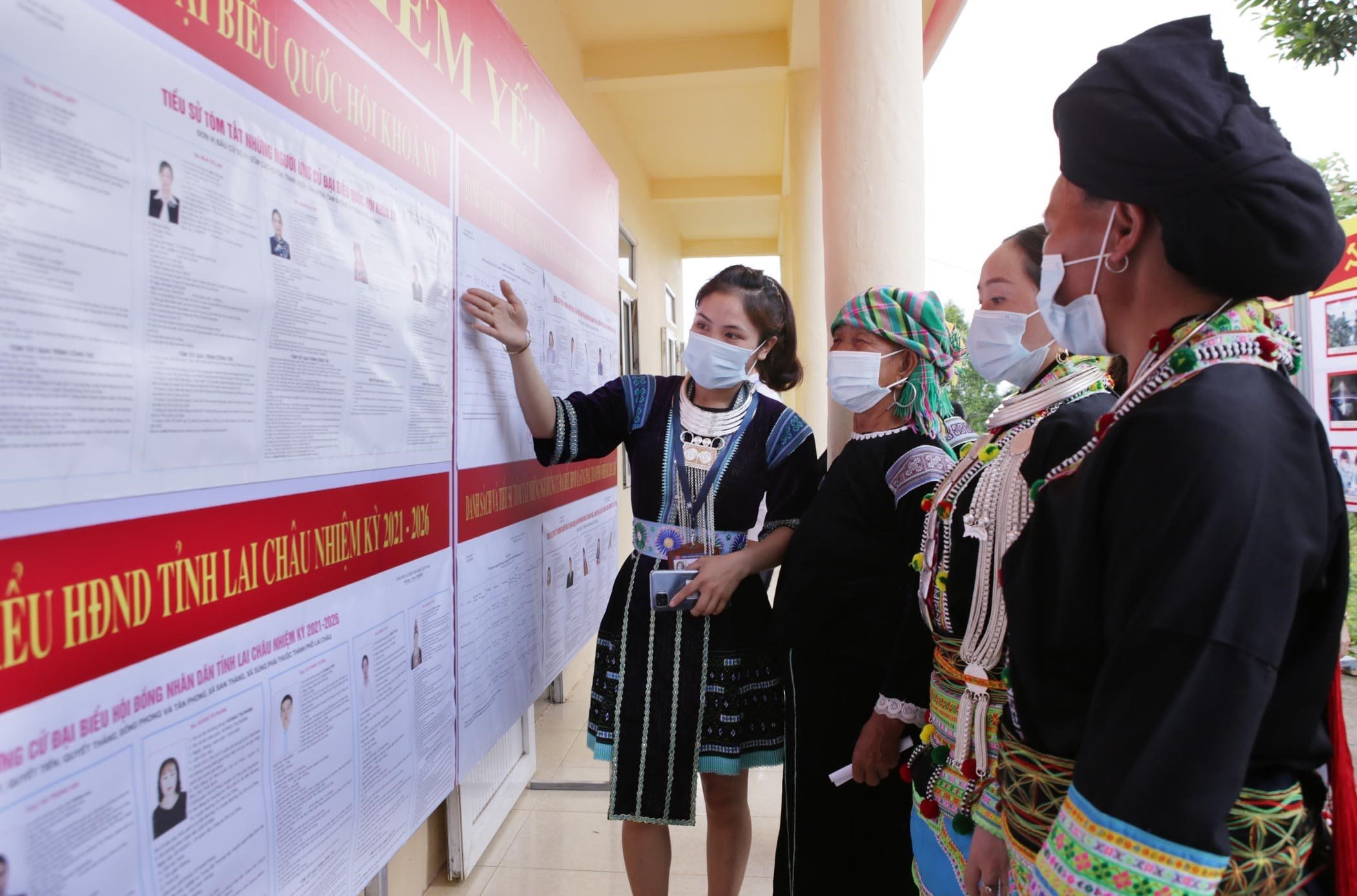Des électeurs de Lai Chau, au Nord du Vietnam, consultent les informations personnelles des candidats à l'Assemblée nationale et aux Conseils populaires de tous niveaux de la XVe législature avant de procéder au vote.