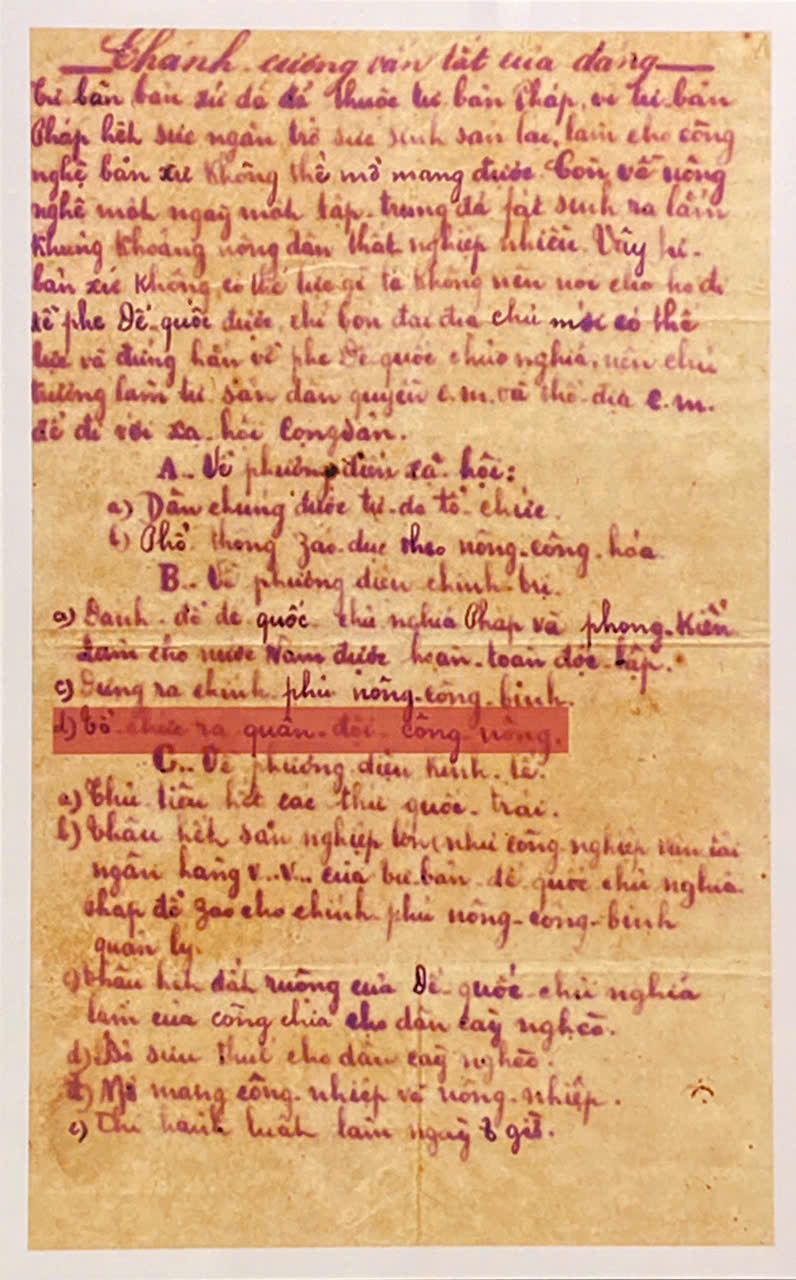 Le Programme abrégé du Parti communiste vietnamien, rédigé par Nguyên Ai Quôc et adopté lors de la conférence de la fondation du Parti en février 1930. Photo : Département des archives du Bureau du Comité central du Parti.