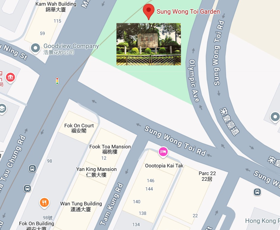 La position actuelle de la rue Tam Kung et du parc Sung Wong Toi (Parc Tống Vương Đài), une zone ayant été un lieu clé des activités révolutionnaires de Nguyễn Ái Quốc et de la conférence fondatrice du Parti communiste vietnamien en 1930. La pierre gravée « Sung Wong Toi », vestige historique de la colline Tống Vương, est aujourd'hui préservée dans ce parc. Photo : Données cartographiques de Google Maps.