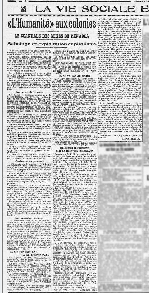 L'article intitulé « Quelques réflexions sur la question colonial », publié dans L’Humanité le 25 mai 1922.