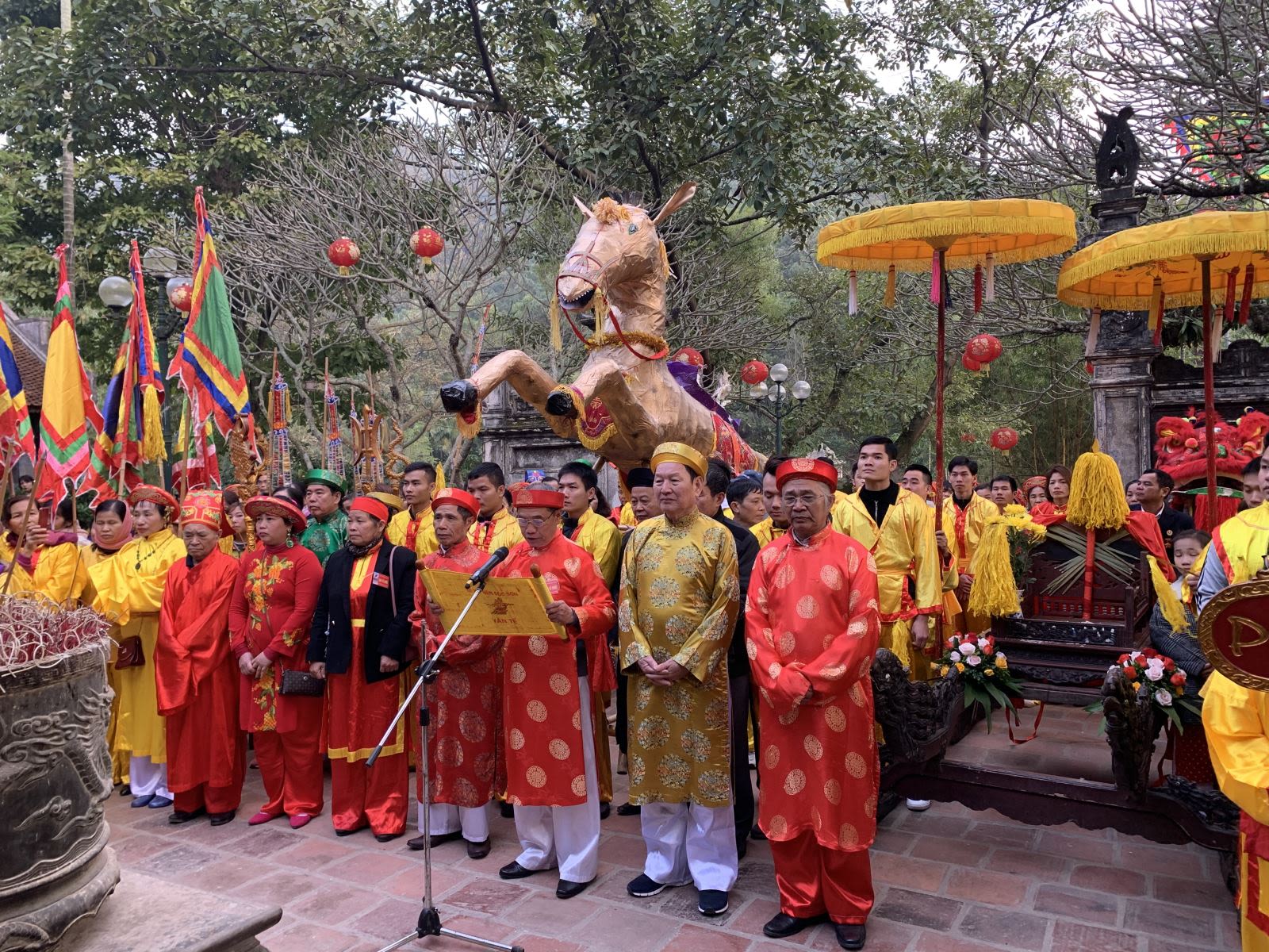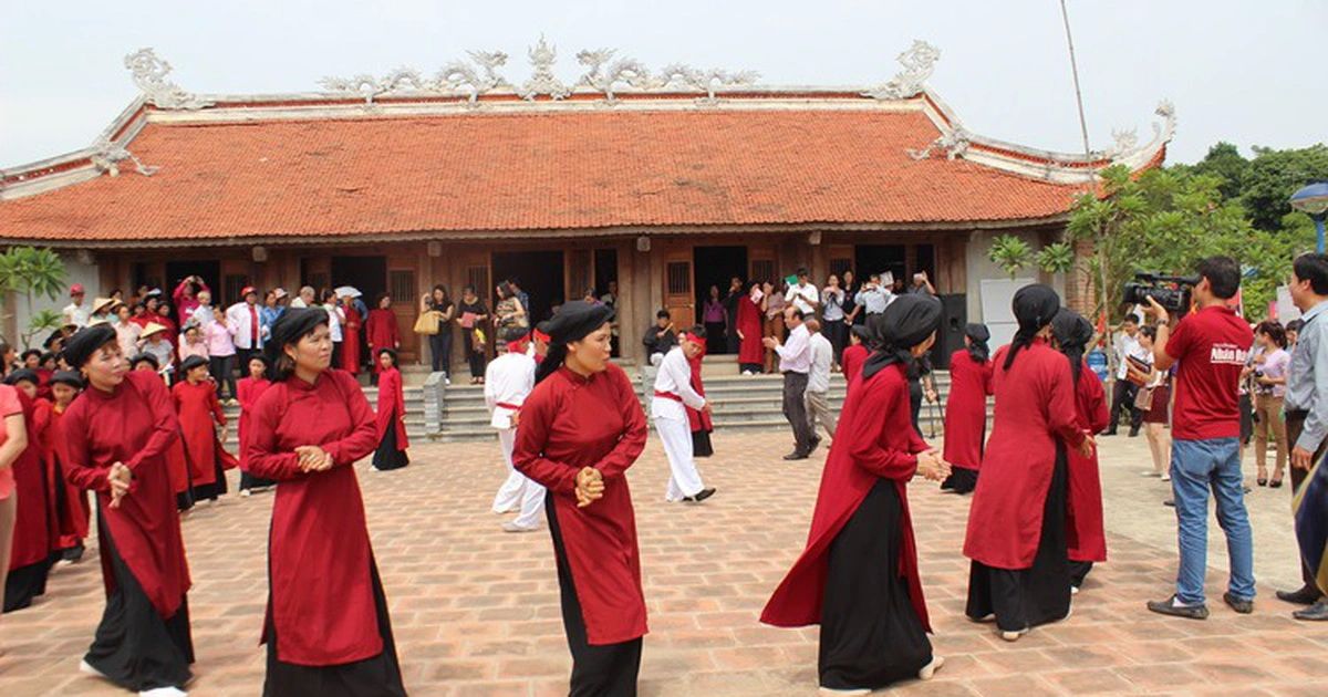 La cérémonie principale, la fête ancestrale de commémoration des rois Hùng, est célébrée pendant près d’une semaine au début du troisième mois lunaire. Les villageois des alentours revêtent de splendides costumes et participent à une compétition du plus beau palanquin et des objets culturels les plus précieux pour le rite principal, pour lequel ils vont au temple principal en procession avec tambours et gongs.