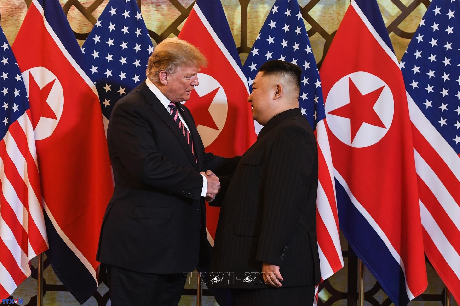 La poignée de main historique entre le président américain Donald Trump et le dirigeant nord-coréen Kim Jong Un a eu lieu à Hanoï le 27 février 2019. Photo : AFP/VNA.