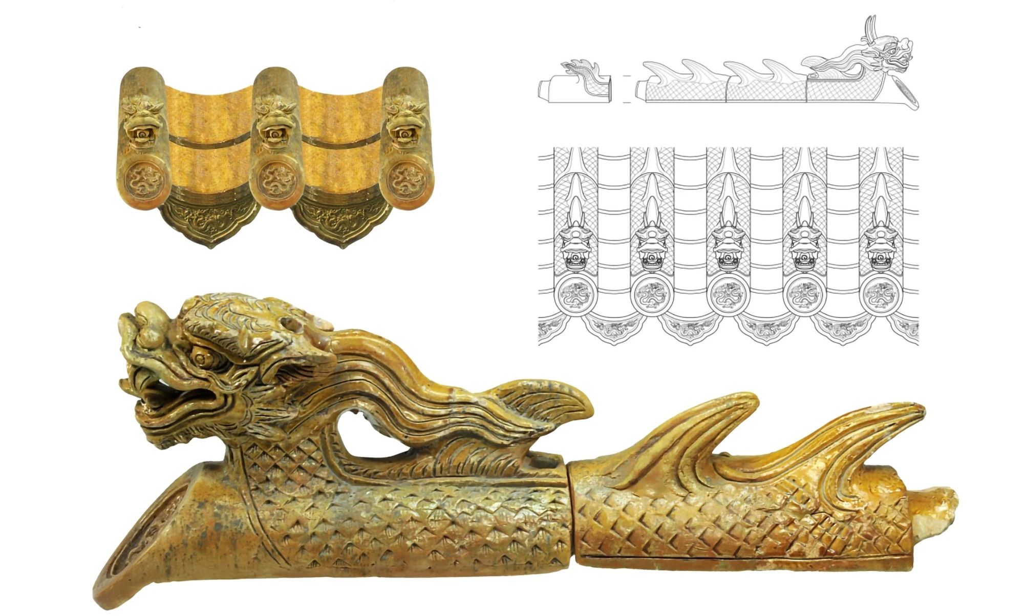 Le carreau en forme de dragon recouvert d'émail jaune représente l'architecture du palais de la citadelle impériale de Thang Long.