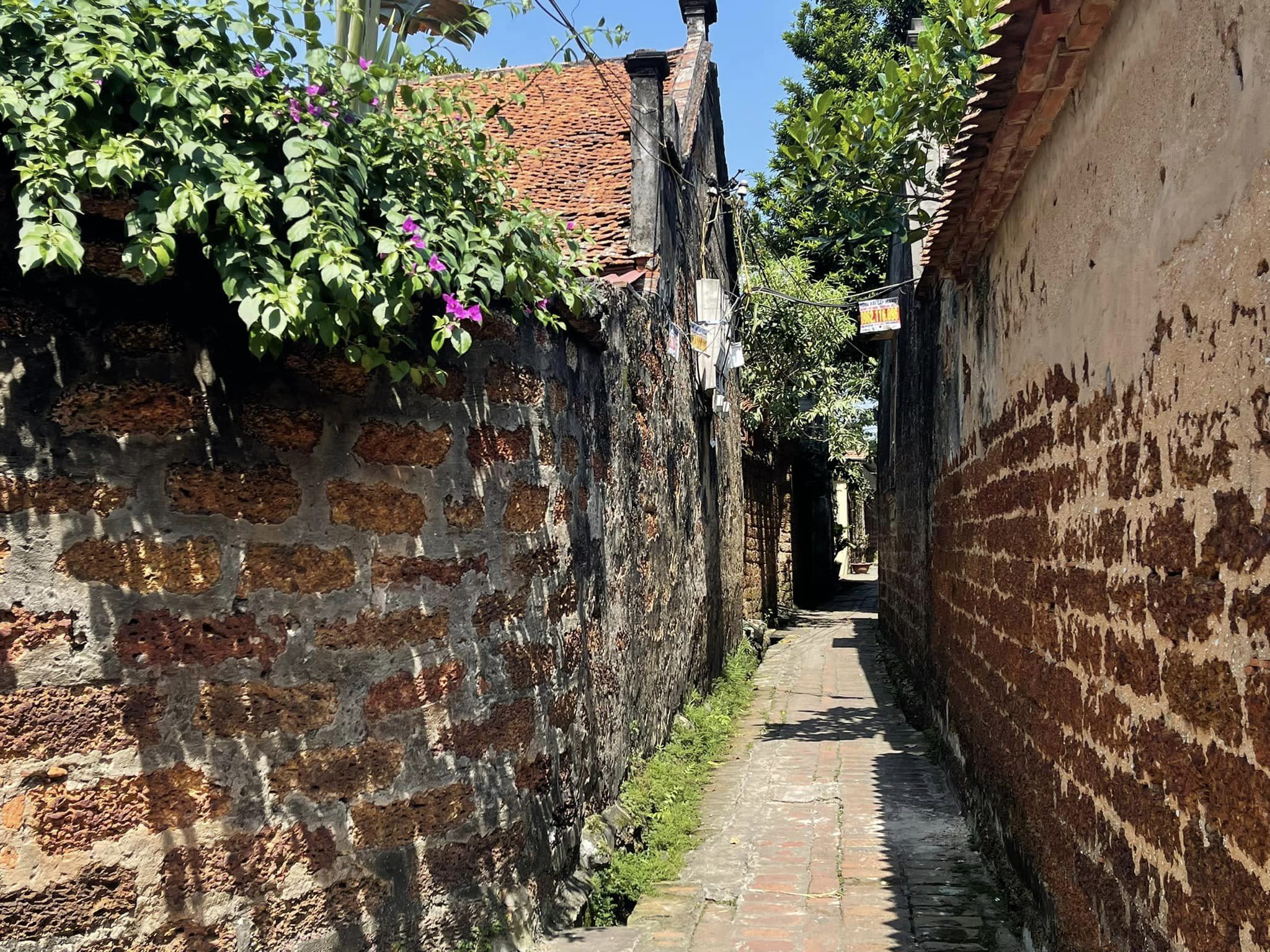 Les petites ruelles avec des murs en briques de latérite des deux côtés sont une caractéristique de l’ancien village de Duong Lam. Photo : Nina May