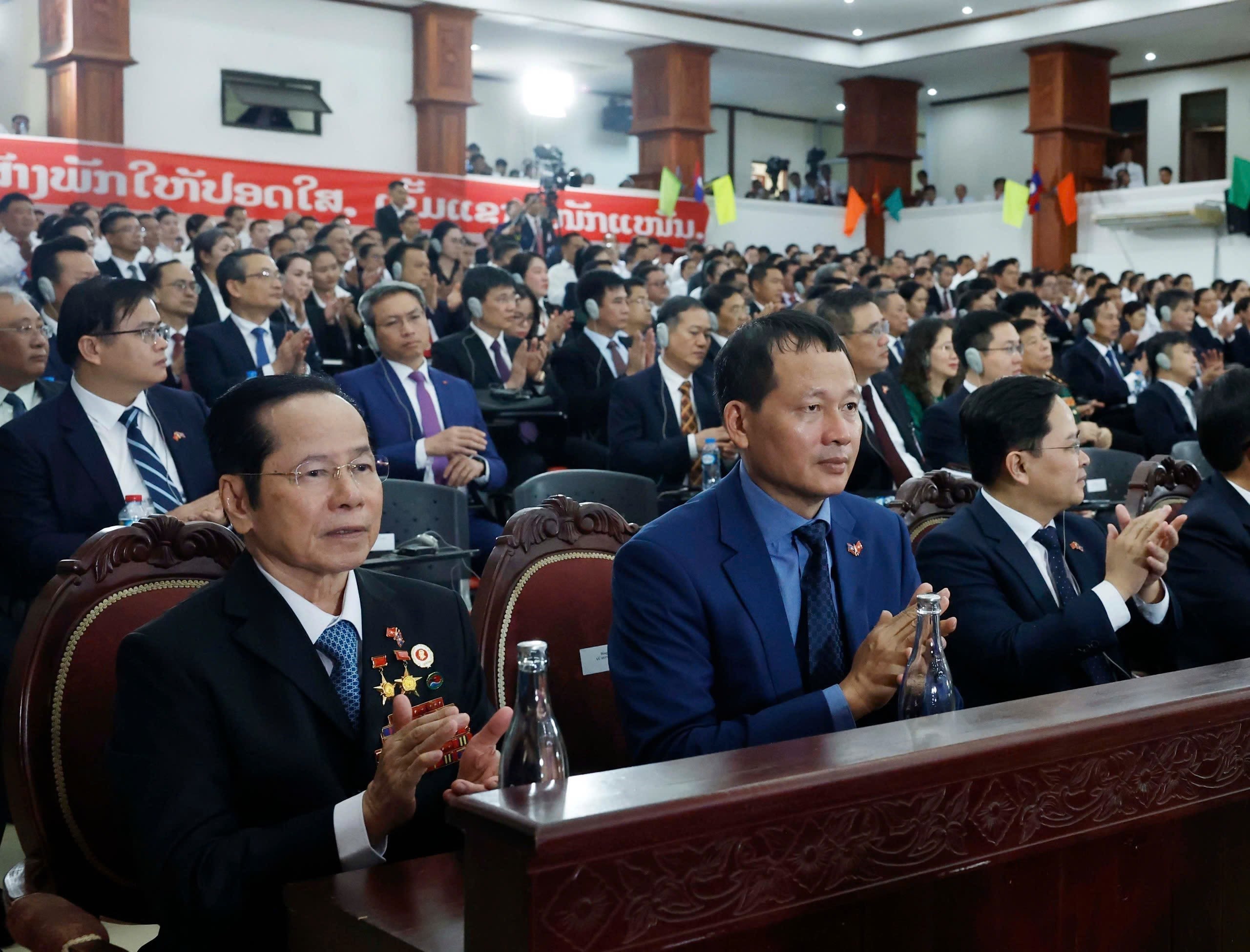 Les délégués écoutent le discours du secrétaire général du PCV, To Lam, à l’Académie politique et administrative nationale du Laos. Photo : VNA.