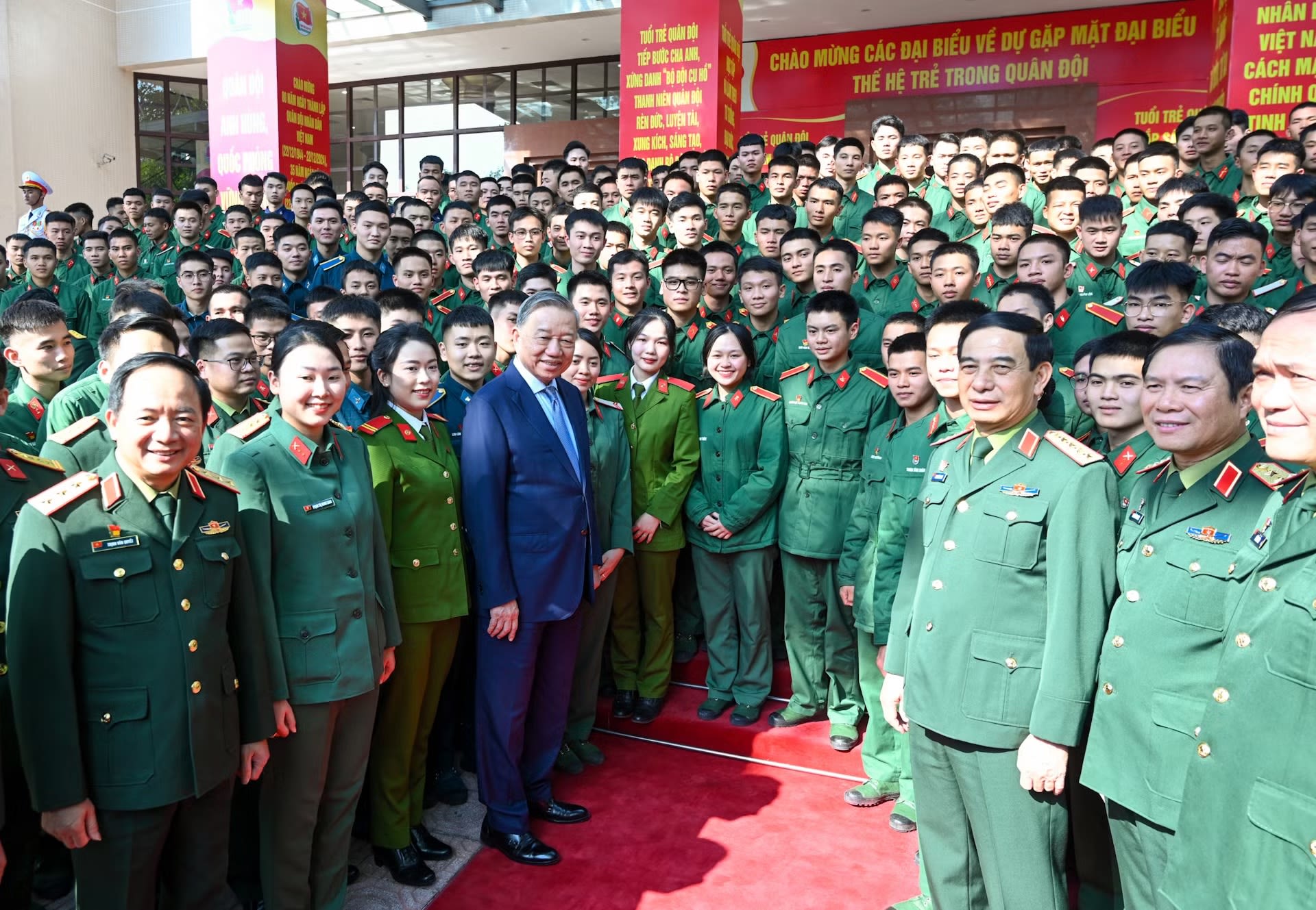 Le Secrétaire général du PCV To Lam, aux côtés des dirigeants du ministère de la Défense et de jeunes officiers de l’Armée populaire du Vietnam, en décembre 2024.