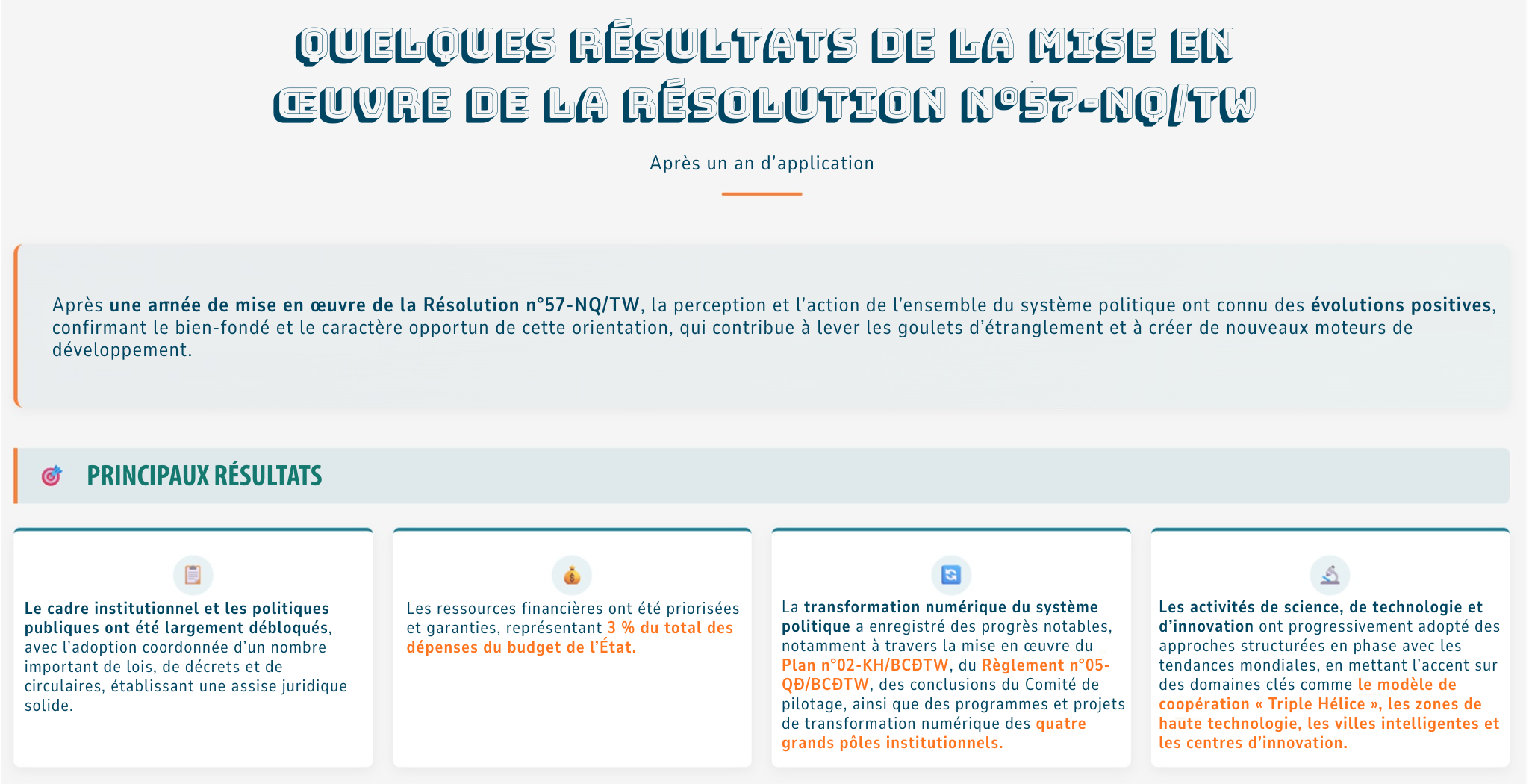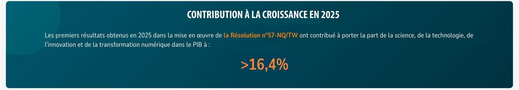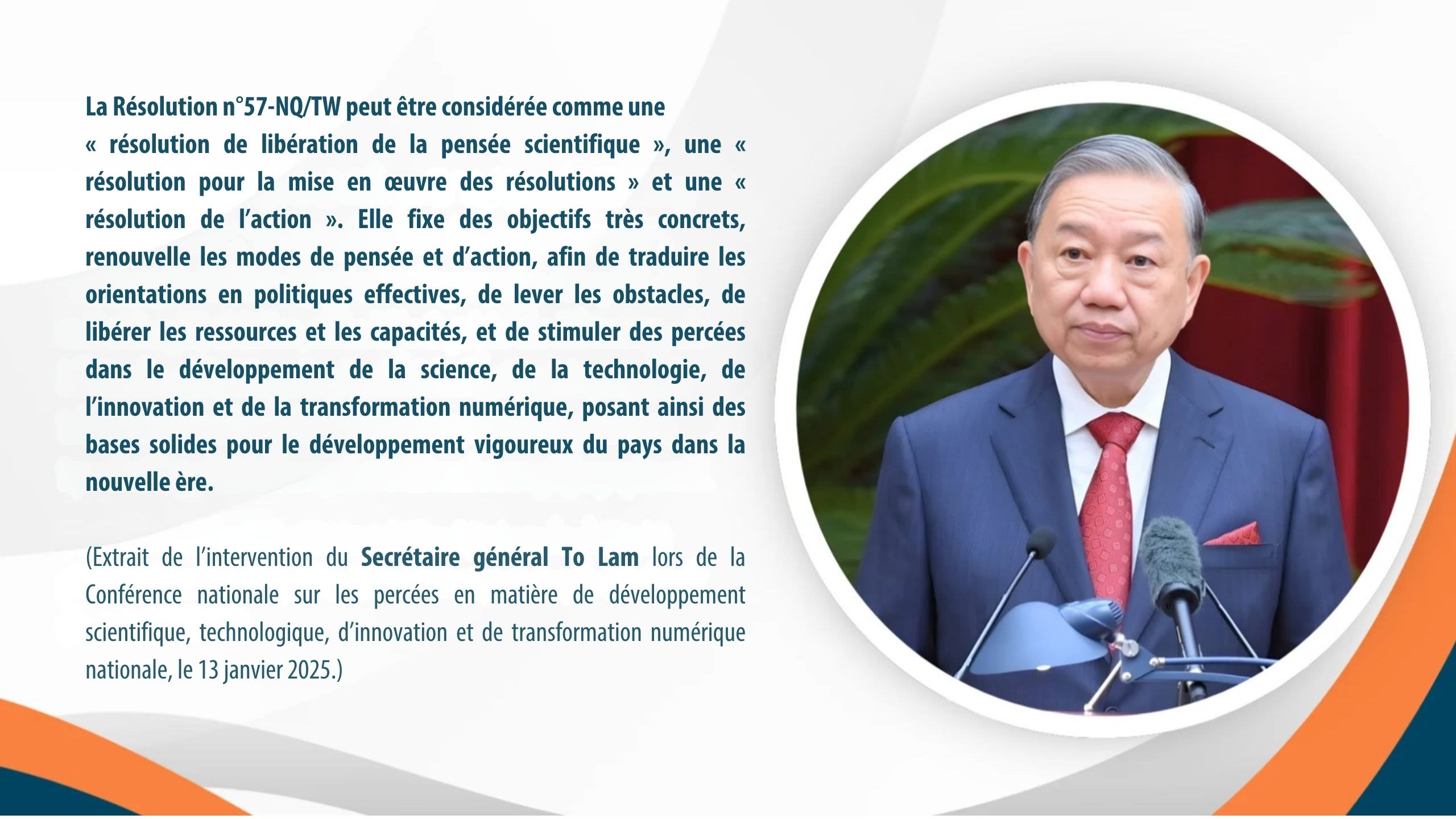 La Résolution n°57-NQ/TW traduit une orientation et des décisions fortes, à caractère stratégique et transformateur, visant à créer un nouvel élan de développement. Elle affirme que les percées dans le développement de la science, de la technologie, de l’innovation et de la transformation numérique constituent une condition préalable essentielle pour permettre au pays de se développer vigoureusement dans une nouvelle ère — une ère de prospérité et de puissance. La Résolution contribue ainsi à la réalisation des objectifs fixés : faire du Vietnam, d’ici 2030, un pays en développement doté d’une industrie moderne et d’un revenu intermédiaire supérieur, puis, à l’horizon 2045, un pays développé à revenu élevé, selon l’orientation socialiste.