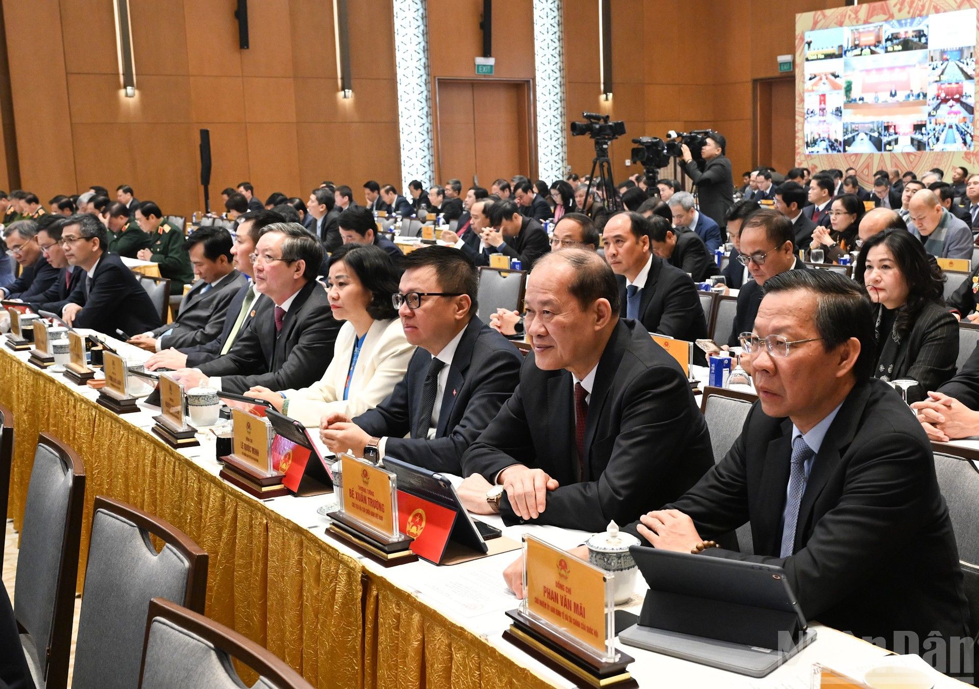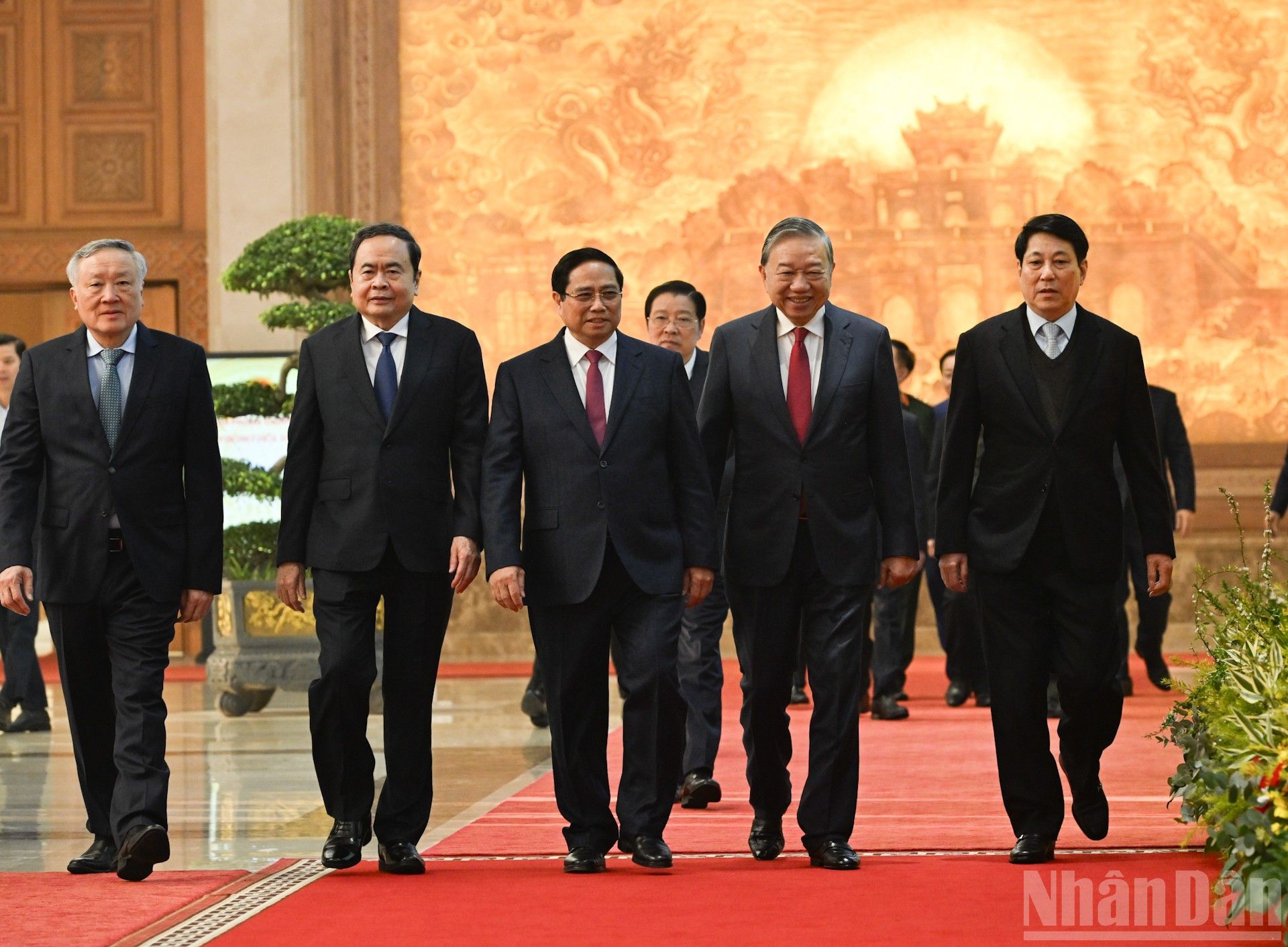 Le Secrétaire général du PCV To Lam, le Président de la République Luong Cuong, le Premier ministre Pham Minh Chinh, le Président de l’Assemblée nationale Tran Thanh Man, le Permanent du Secrétariat du Comité central du PCV Tran Cam Tu et le Vice-Premier ministre permanent Nguyen Hoa Binh assistent à la conférence.
