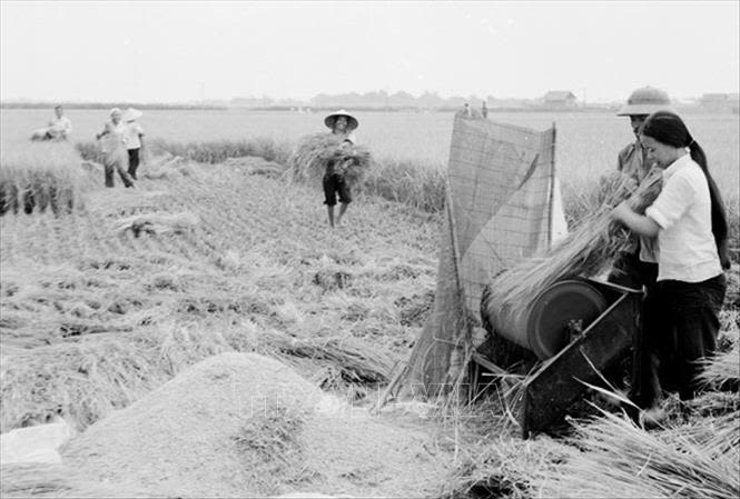 Des habitants utilisent un batteur de riz à pédale pour augmenter la productivité agricole. Photo : VNA.