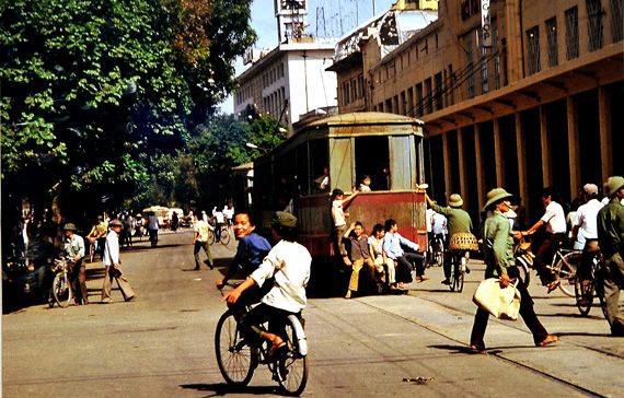 Tramway dans la rue Đinh Tiên Hoàng, Hanoï 1983. Photo de l'auteur Michel Blanchard (Source : Journal électronique du Parti communiste du Vietnam).