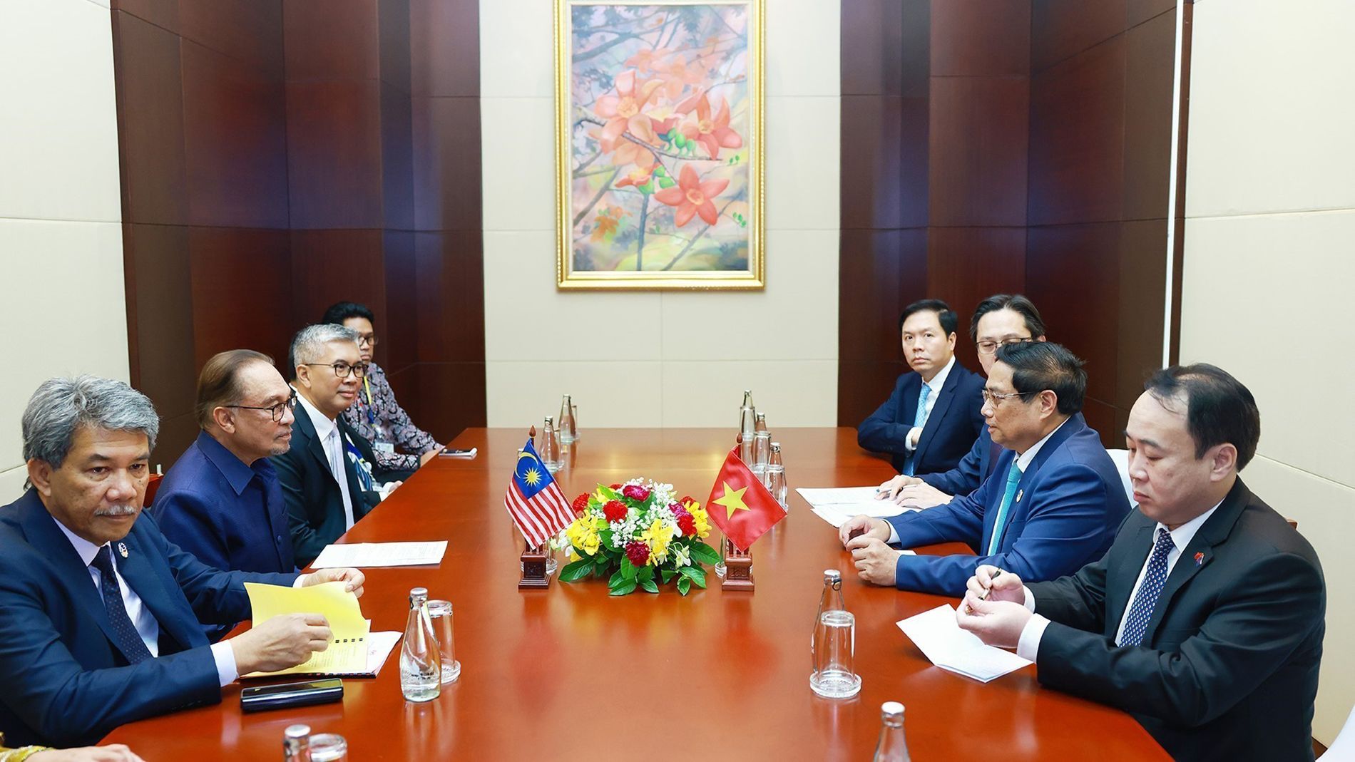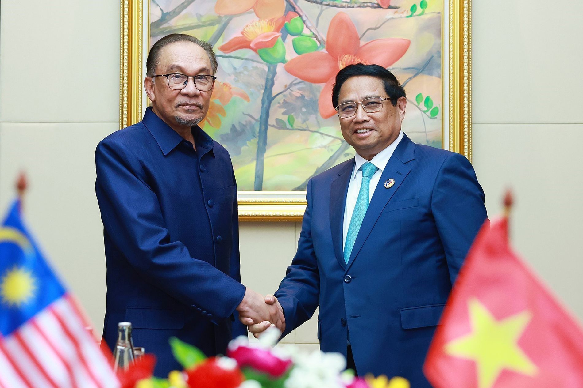 Rencontre entre le Premier ministre vietnamien Pham Minh Chinh et son homologue malaisien Anwar Ibrahim, dans le cadre des 44e et 45e Sommets de l'ASEAN et des réunions connexes, le 10 octobre 2024 à Vientiane (Laos). Photo : VNA.