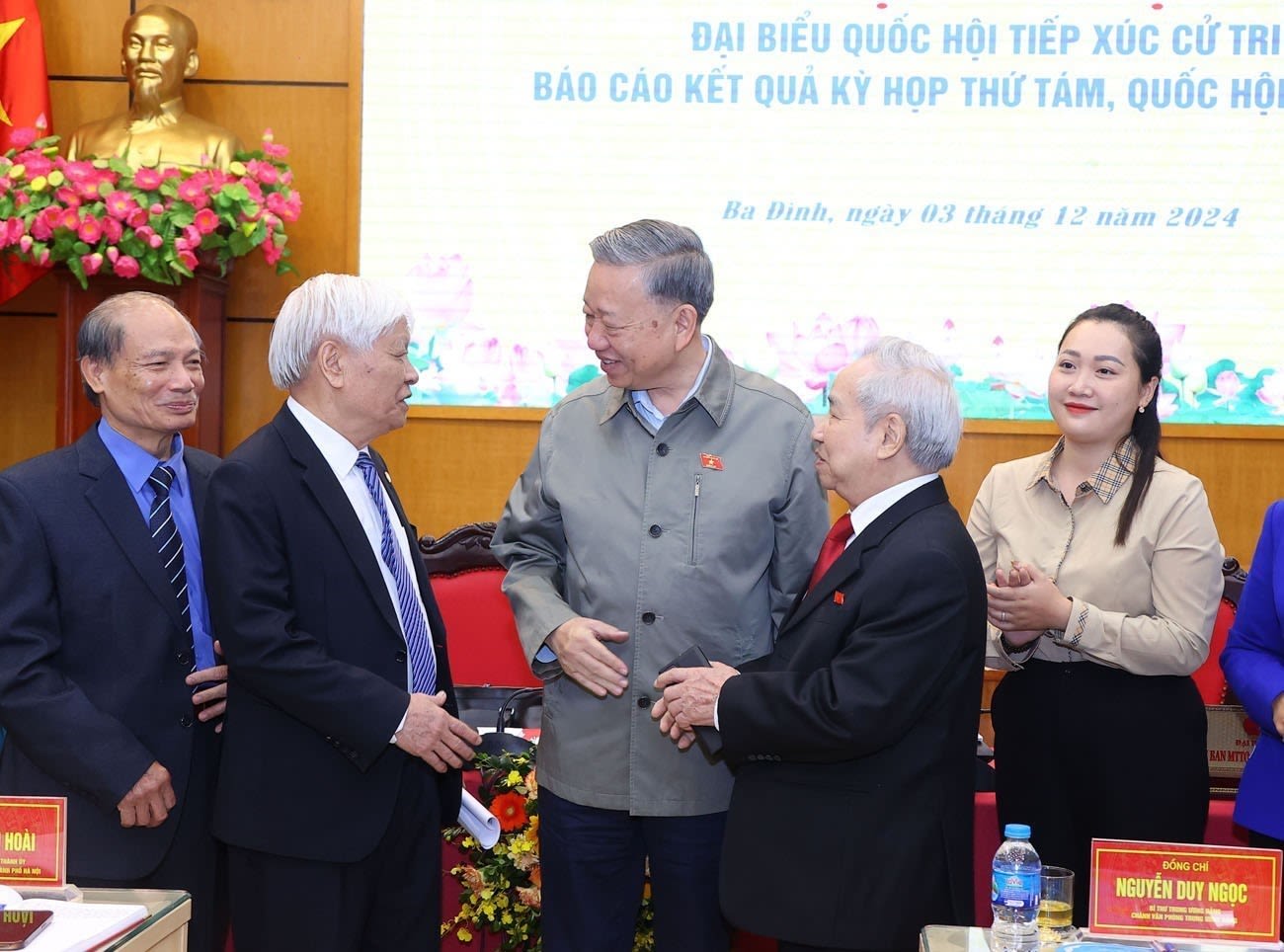Le secrétaire général To Lam et les délégués de la circonscription n°1, la délégation de l'Assemblée nationale de la ville de Hanoi, rencontrent les électeurs des districts de Ba Dinh, Dong Da et Hai Ba Trung pour leur annoncer des résultats de la 8e session de la XVe Assemblée nationale et écoutent les opinions et recommandations des électeurs, au siège du Conseil populaire et du Comité populaire du district de Ba Dinh, le 3 décembre 2024. Photo : VNA.