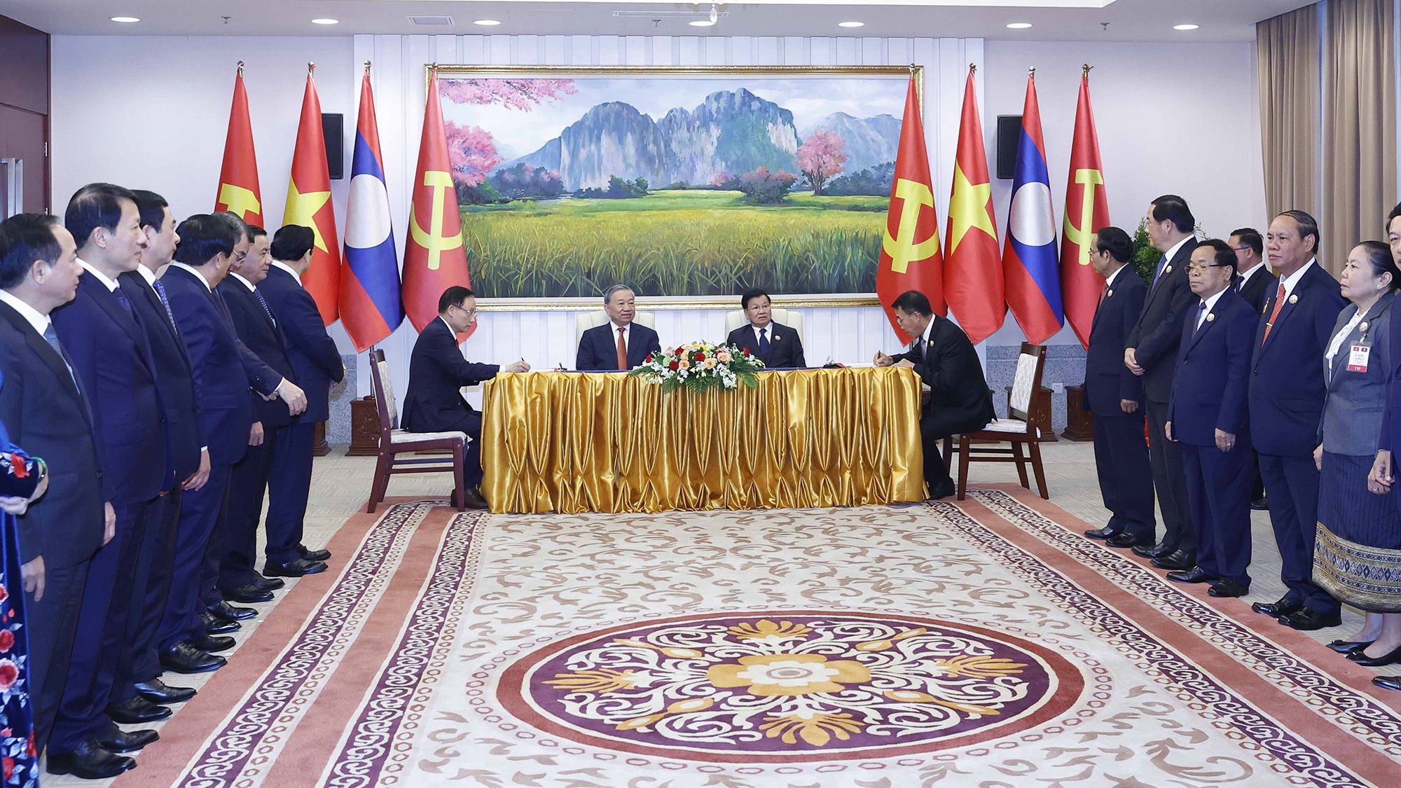 À Vientiane, au Laos, où s’est tenue la rencontre de haut niveau entre le Parti communiste du Vietnam et le Parti révolutionnaire populaire laotien (PRPL), coprésidée par le Secrétaire général du PCV To Lam et le Secrétaire général et président du Laos, Thongloun Sisoulith.