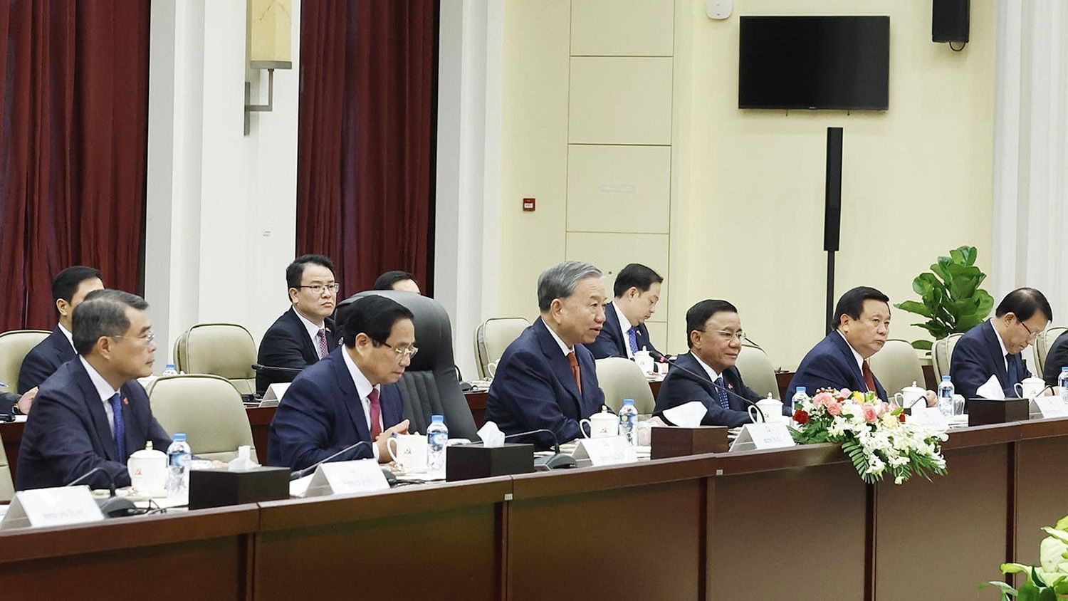 Le Secrétaire général du PCV To Lam et le Secrétaire général, Président de la République démocratique populaire lao Thongloun Sisoulith ont eu un entretien restreint. Photo : VNA.