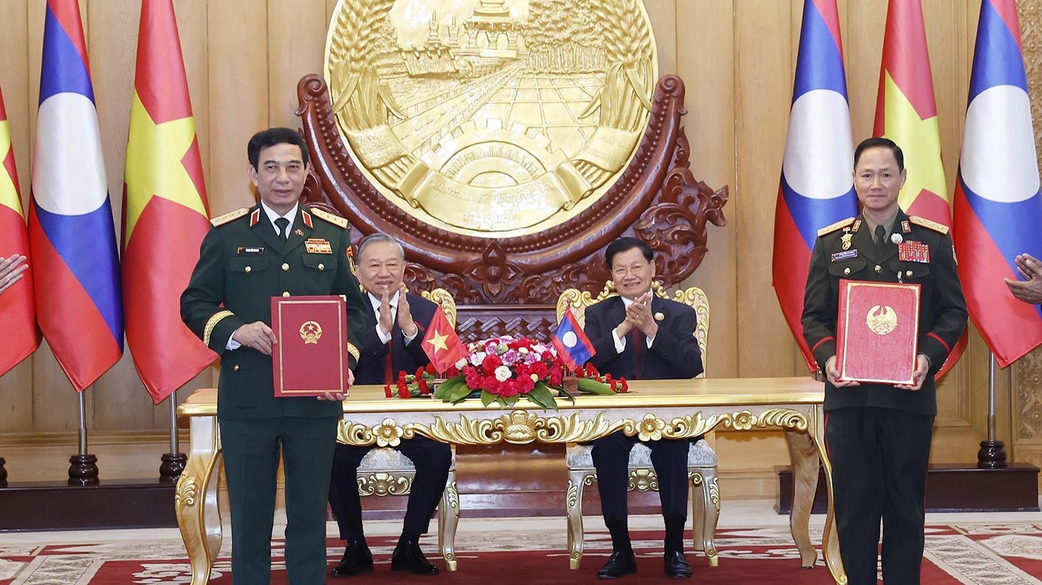 Le Secrétaire général du PCV To Lam et le Secrétaire général et président du Laos, Thongloun Sisoulith, témoignent de l'échange du Plan de coopération pour 2026 entre les ministères vietnamien et laotien de la Défense. Photo : VNA.