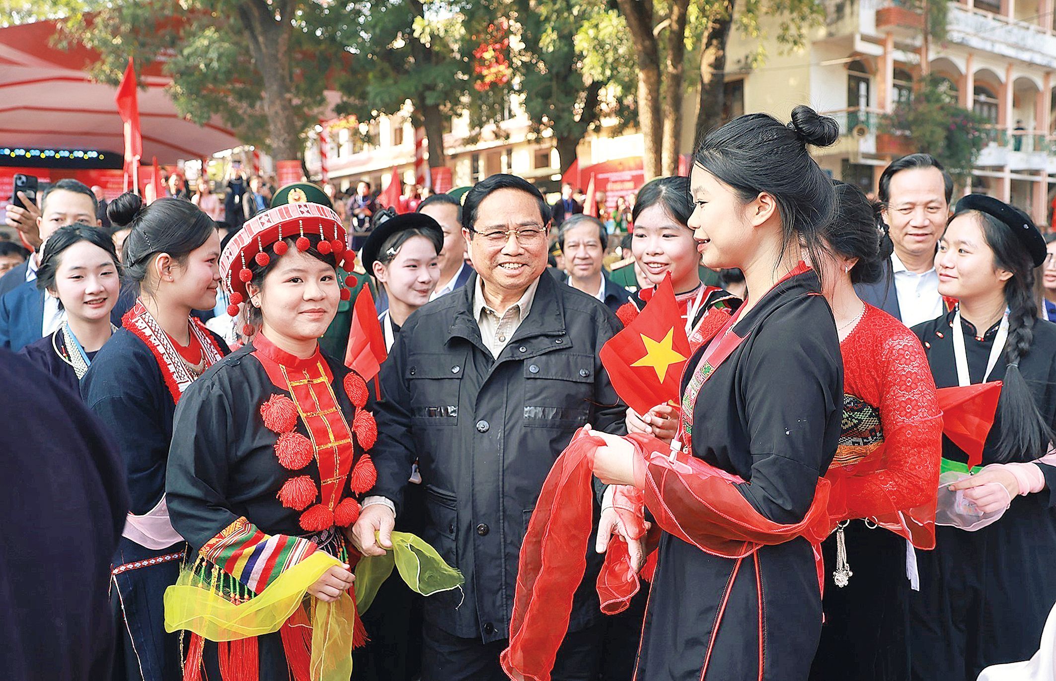 Le Premier ministre vietnamien Pham Minh Chinh avec des élèves de l’École secondaire des régions montagneuses du Viet Bac, à Thai Nguyen. Photo : VNA.