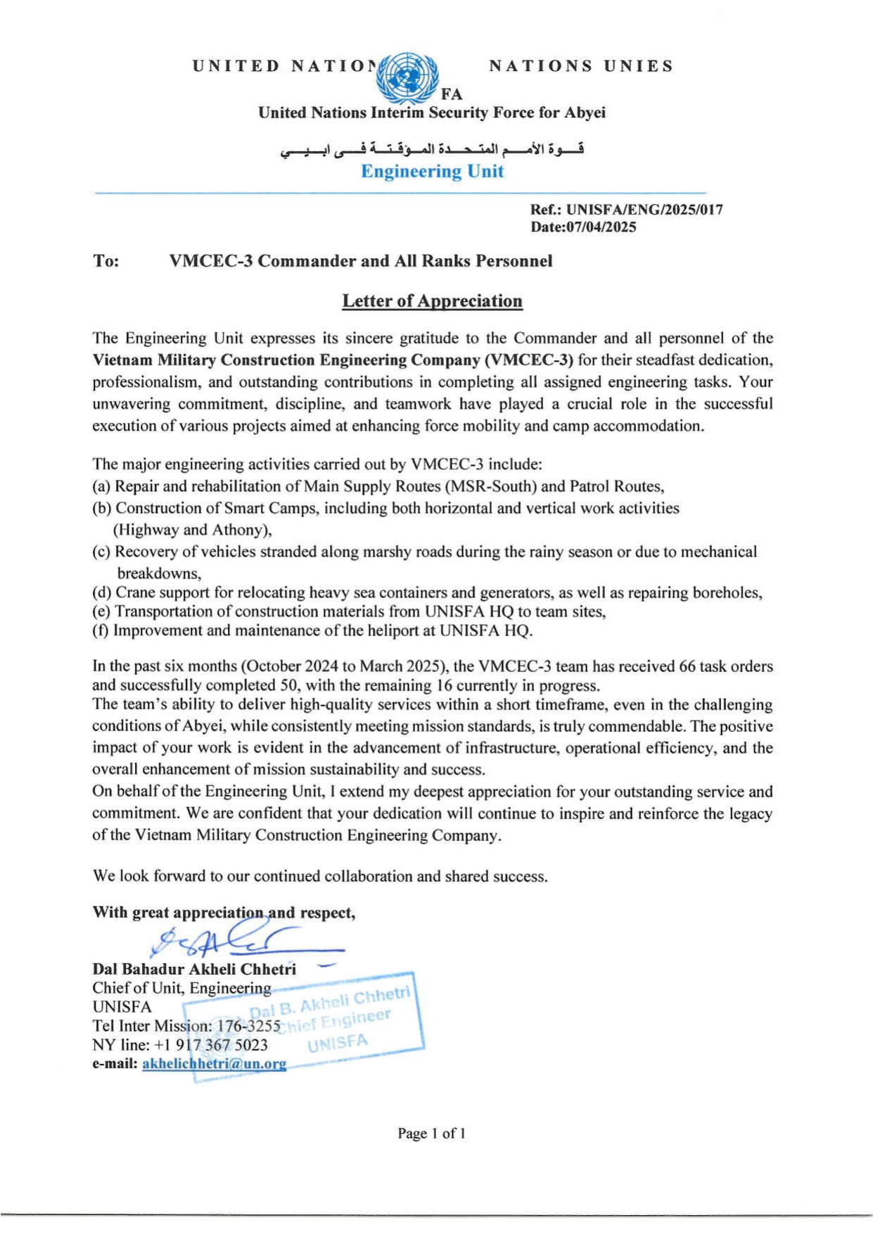 Dans une lettre datée du 7 avril 2025, le Bureau du Génie militaire de la Mission intérimaire de sécurité des Nations Unies à Abyei a adressé ses remerciements les plus sincères au commandant et à l’ensemble des officiers et soldats de la 3ᵉ Unité du Génie militaire vietnamien pour leur dévouement, leur professionnalisme et leurs contributions remarquables à l’accomplissement de toutes les missions de génie qui leur ont été confiées. Le sérieux dans l’exécution des tâches, la discipline et l’esprit d’équipe de votre unité ont joué un rôle essentiel dans le succès des opérations d’entretien des voies de mobilité et d’amélioration des infrastructures et casernes.