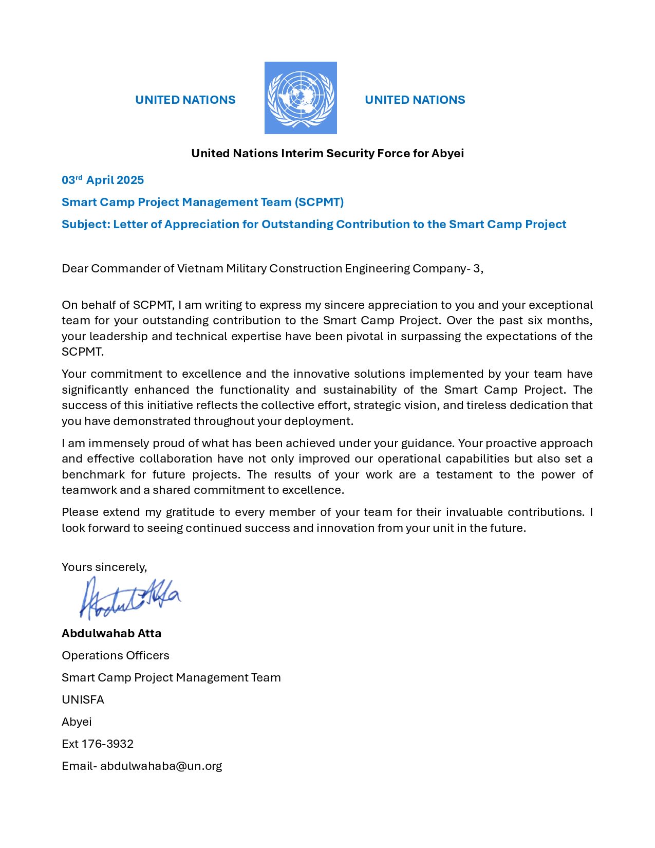 Dans une lettre de remerciement adressée au commandant de la 3e unité du génie militaire vietnamien, en date du 3 avril 2025, le Bureau de gestion du projet de camp intelligent de la Mission intérimaire de sécurité des Nations Unies à Abyei a exprimé sa gratitude pour les contributions remarquables de l’unité au projet de la caserne intelligente. La lettre mentionne notamment : « Au cours des six derniers mois, vos qualités de leadership et votre professionnalisme ont joué un rôle essentiel dans l’accomplissement des missions, dépassant les attentes du Bureau de gestion du projet de camp intelligent. Les efforts fournis par vous-même et les soldats de votre unité, ainsi que les solutions innovantes mises en œuvre, ont contribué à améliorer la qualité opérationnelle et la durabilité des infrastructures du projet. Cela témoigne d’un effort collectif, d’une vision stratégique et d’un engagement sans relâche que vous avez démontrés tout au long du processus de mise en œuvre de vos missions ».