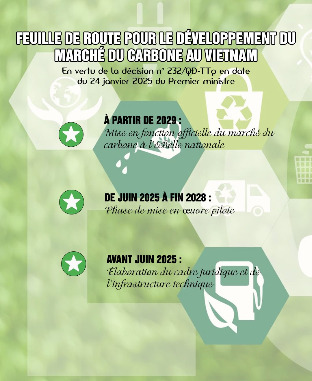 Au Vietnam, la feuille de route pour le développement du marché du carbone a été définie dans la décision n° 232/QD-TTg en date du 24 janvier 2025 du Premier ministre, avec une phase pilote qui débutera en juin 2025 et un déploiement national prévu à partir de 2029. La phase pilote permettra de tester les mécanismes d’échange et d’affiner le cadre juridique, posant ainsi les bases pour un fonctionnement efficace du marché du carbone dans l’avenir.