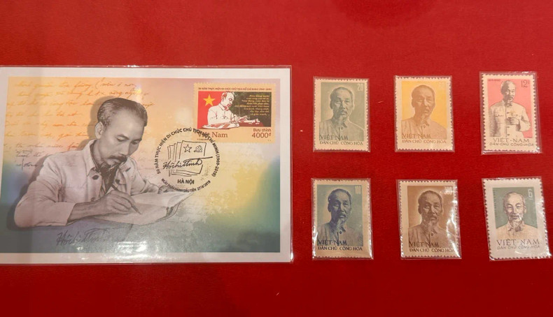 On y trouve également des timbres à l'effigie de l'Oncle Hô émis dans des pays tels que le Laos, le Cambodge, l'Allemagne, la Russie - affirmant que l'image et la pensée d'Hô Chi Minh sont un héritage culturel à portée mondiale.