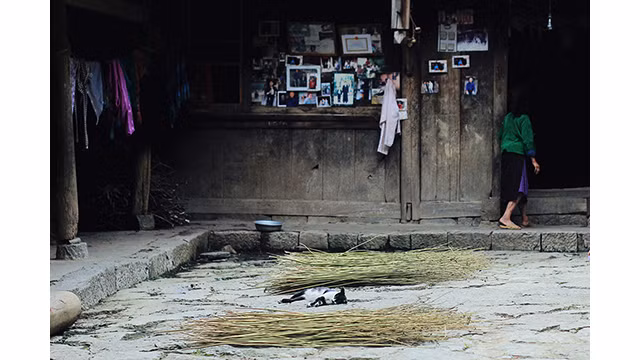La porte en bois menant à la maison est flanquée par des murs de clôture en pierre typiques des H'mông, entièrement construits à partir de rochers empilés sans ciment ni chaux. Et comme des milliers de maisons sur le plateau calcaires de Dông Van, à côté des murs de clôture en pierre sont plantées des pêches et des prunes. Les plantes remplissent la porte de leurs fleurs au printemps puis des fruits en été.